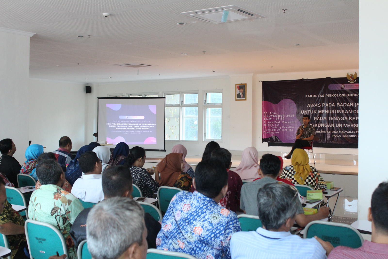 On Tuesday (5/11), the Faculty of Psychology held community service activities in the form of compassion training and forgiveness for stress management. This activity was coordinated by a team of lecturers consisting of Yohanis Franz La Kahija, Amalia Rahmandani, and Hastaning Sakti and was attended by 55 education personnel of Diponegoro University. Participants are the educational staff from the Faculty of Law, Faculty of Cultural Sciences, Faculty of Psychology, and Vocational Schools. The activity which lasted for approximately two hours took place in the hall of Prof. Darmanto Jatman Faculty of Psychology.