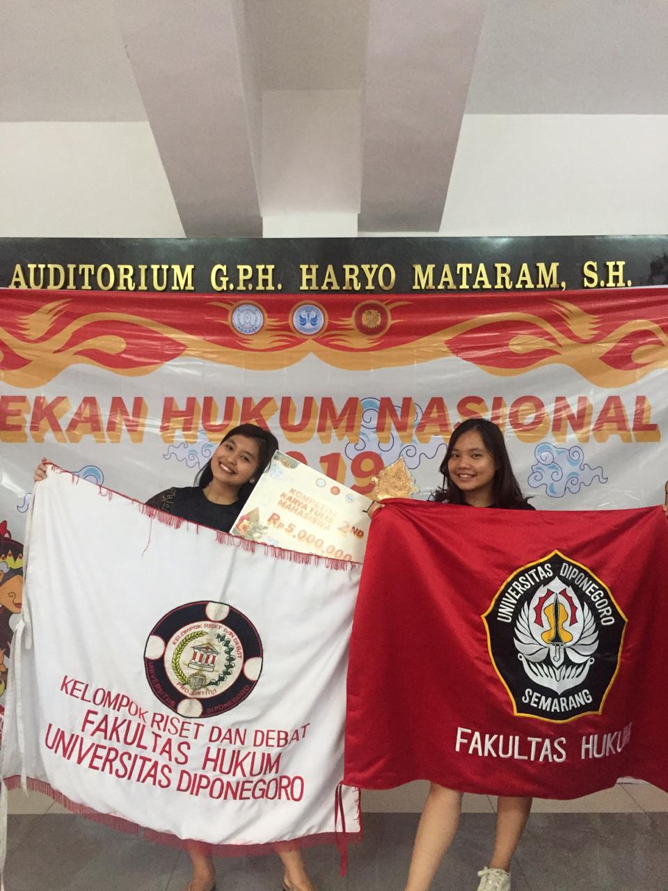 The Faculty of Law Diponegoro University Delegation won 1st place on the Legislative Drafting category and Second Place in the Scientific Writing Contest in each competition, followed by five Delegations from other Faculty of Law in Indonesia .
