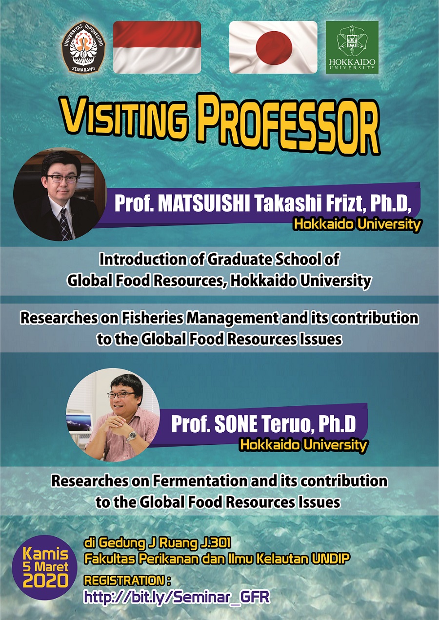 Thursday, March 5, 2020 Diponegoro University was visited by 2 professors from Hokkaido University, Japan. The professors aimed in giving public lectures and promoting Graduate School of Global Food Resources (GFR) as well as discussing a potential collaboration. Please note that GFR is a graduate school from the Faculty of Agriculture, Hokkaido University, which has the goal of being a world-class leader in overcoming the world food crisis.