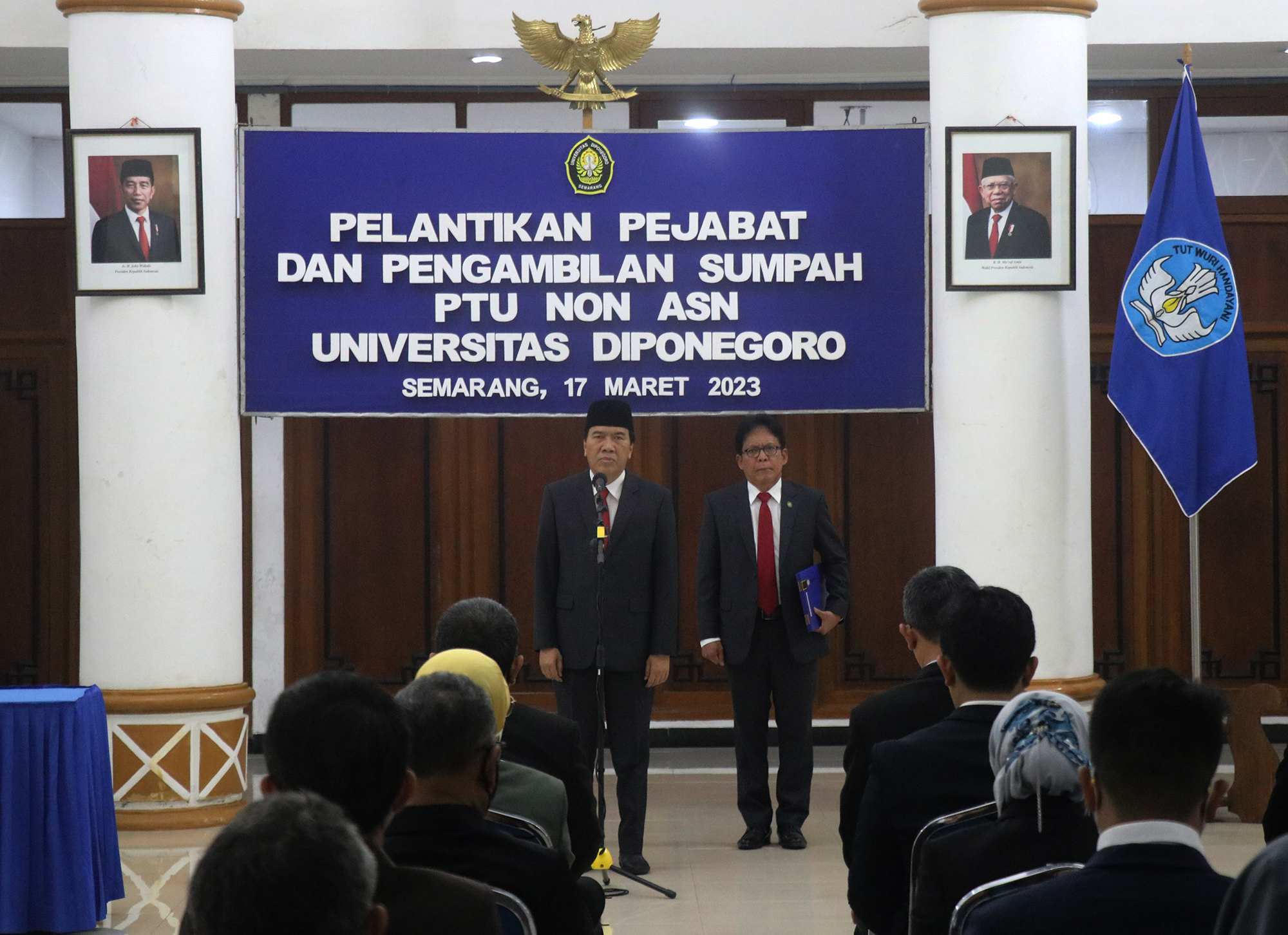 The Ceremony of Inaugurating Officials and Taking the Oath of Non State Civil Apparatus Permanent Employees (PTU Non ASN) at Diponegoro University was held on Friday, March 17, 2023 at 13.30 in the Hall of the SA-MWA Undip Building, Tembalang, Semarang. This event was led by Undip Rector, Prof. Dr. Yos Johan Utama, S.H., M.Hum. by inviting Undip officials and prospective employees to be inaugurated.