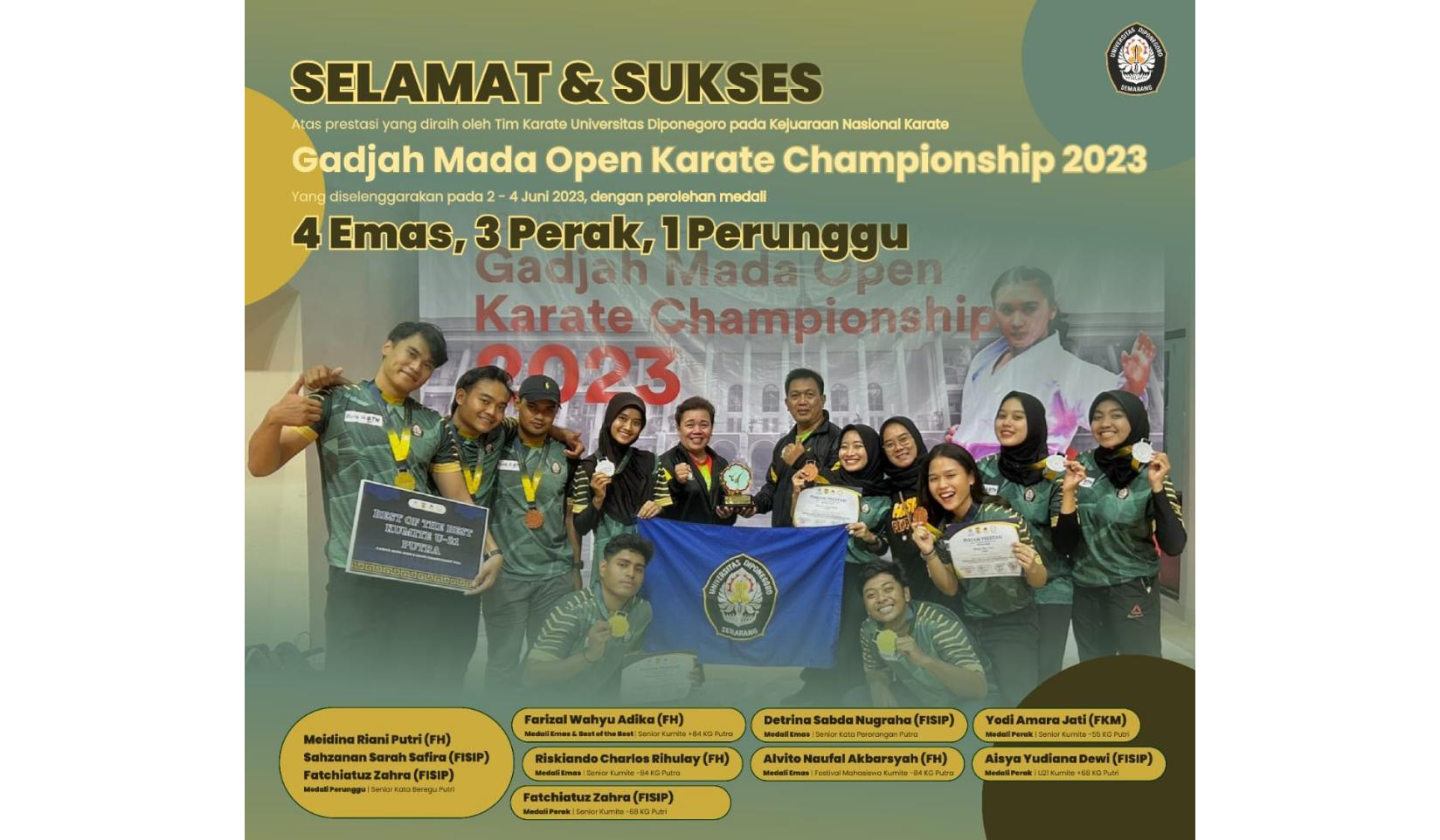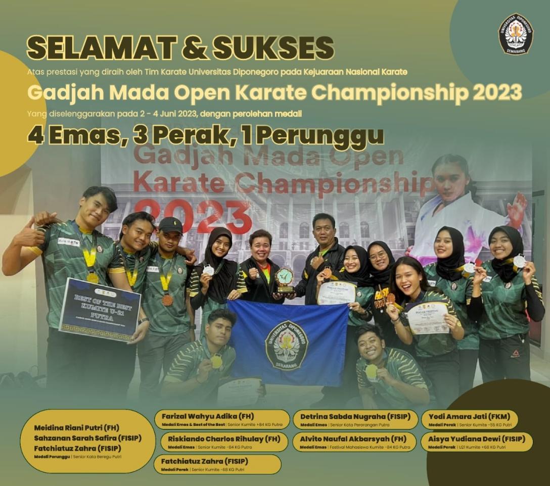 The Diponegoro University (Undip) Karate Team achieved a proud achievement. Undip Karate Team won 4 (four) gold medals, 3 (three) silver medals, and 1 (one) bronze medal at the 2023 Gadjah Mada Open Karate Championship, which was held June 2-4, 2023, at the GOR Pancasila Gadjah Mada University (UGM) Yogyakarta.