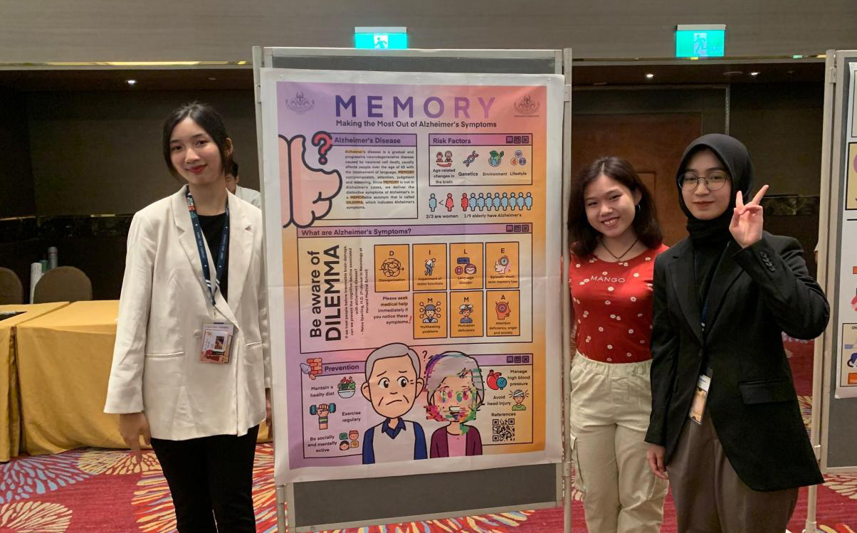The AMSA Undip team consists of 3 (three) members: Aditya Putri Setyanegari, Fadya Safitri, and Elizabeth Charissa Atmawidjaja. All three are Medical students class of 2022. As a supervisor, dr. Ryan Halleyantoro, M. Biomed, Sp. Par(K). Representing the team, Aditya Putri Setyanegari explained, “Our Public Poster entitled MEMORY: Making the Most Out of Alzheimer’s Symptoms aims to provide understanding to the wider community regarding the urgency of knowing the symptoms of Alzheimer’s disease. Our poster contains a definition of Alzheimer’s disease, risk factors for Alzheimer’s disease, and symptoms of Alzheimer’s disease, which we package in an acronym, “DILEMMA,” along with ways to prevent Alzheimer’s disease. We hope that people who read our posters can understand Alzheimer’s disease and the symptoms of Alzheimer’s disease so that medical treatment can be obtained as early as possible and prevent Alzheimer’s disease from getting worse,” she said.