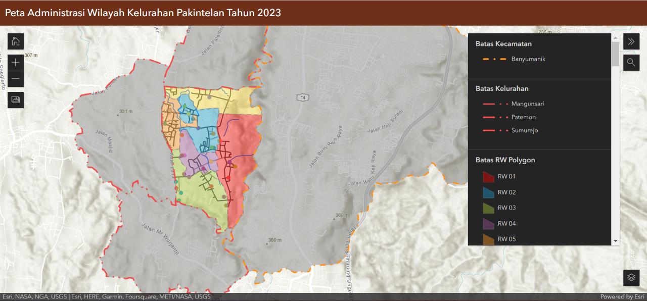 For the purposes of monitoring existing regional developments, so as to maintain the relevance of information, the 2023 Pakintelan Village Administration Map was also developed on a website basis via WebGIS as an interactive medium that can be freely accessed by the public—either via smartphones, laptops, computers, tablets and other hardware based on internet. The sophisticated features on the website are able to provide informative and communicative access, such as the presentation of spatial entities symbolized by KUGI standardization (Catalog of Indonesian Geographical Elements), changeable features on the base map from simple mode, roadmap, hybrid, terrain to satellite, ease of searching for entities through the search location feature, layer settings that can be hidden or reappeared and other advanced features in WebGIS that the public can freely access. Meanwhile, the 2023 WebGIS-based Administrative Map of the Pakintelan Village Area can be accessed at the following link: https://bit.ly/WebGISPakintelan.