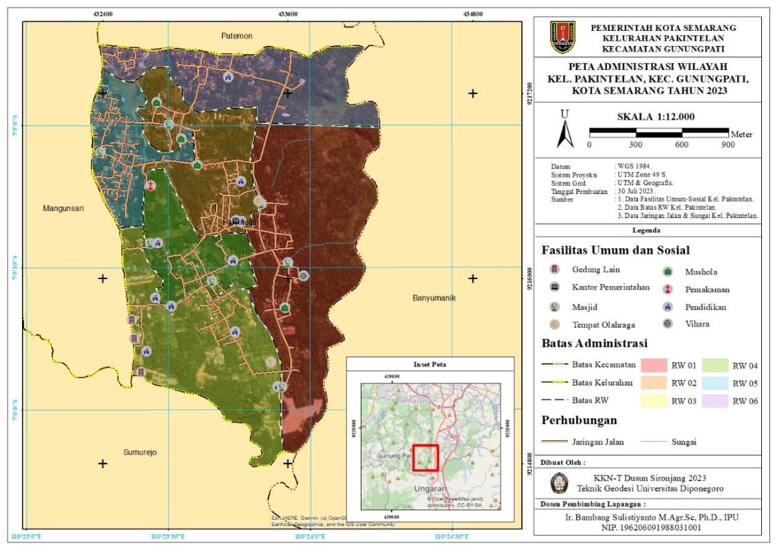 Undip Assisted Village Science and Technology (IDBU) Program Implementation Team in 2023/2024 implemented the theme “Development of Agroecocultural Tourism Villages as Edutourism Areas in Pakintelan Village, Gunungpati District, Semarang City” with Sironjang Sub-Village as the main focus in optimizing the tourist village. Geodetic Engineering knowledge can be applied in the field of regional mapping in order to realize the objectives of the theme of mapping the administrative area of Pakintelan Village.