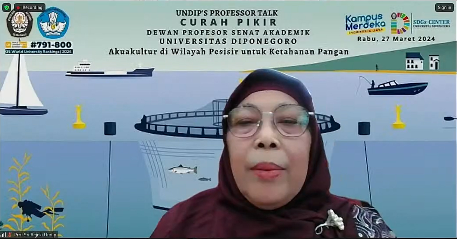 The Diponegoro University (UNDIP) Academic Senate Board of Professors arranged an “Undip’s Professor Talk” Webinar, the 14th series of Diponegoro University Academic Senate Board of Professors Brainstorming, on Wednesday, March 27, 2024, 13.00 WIB on Official Youtube UndipTV. The event raised the theme “Aquaculture on Coastal Area for Food Sustainability.”