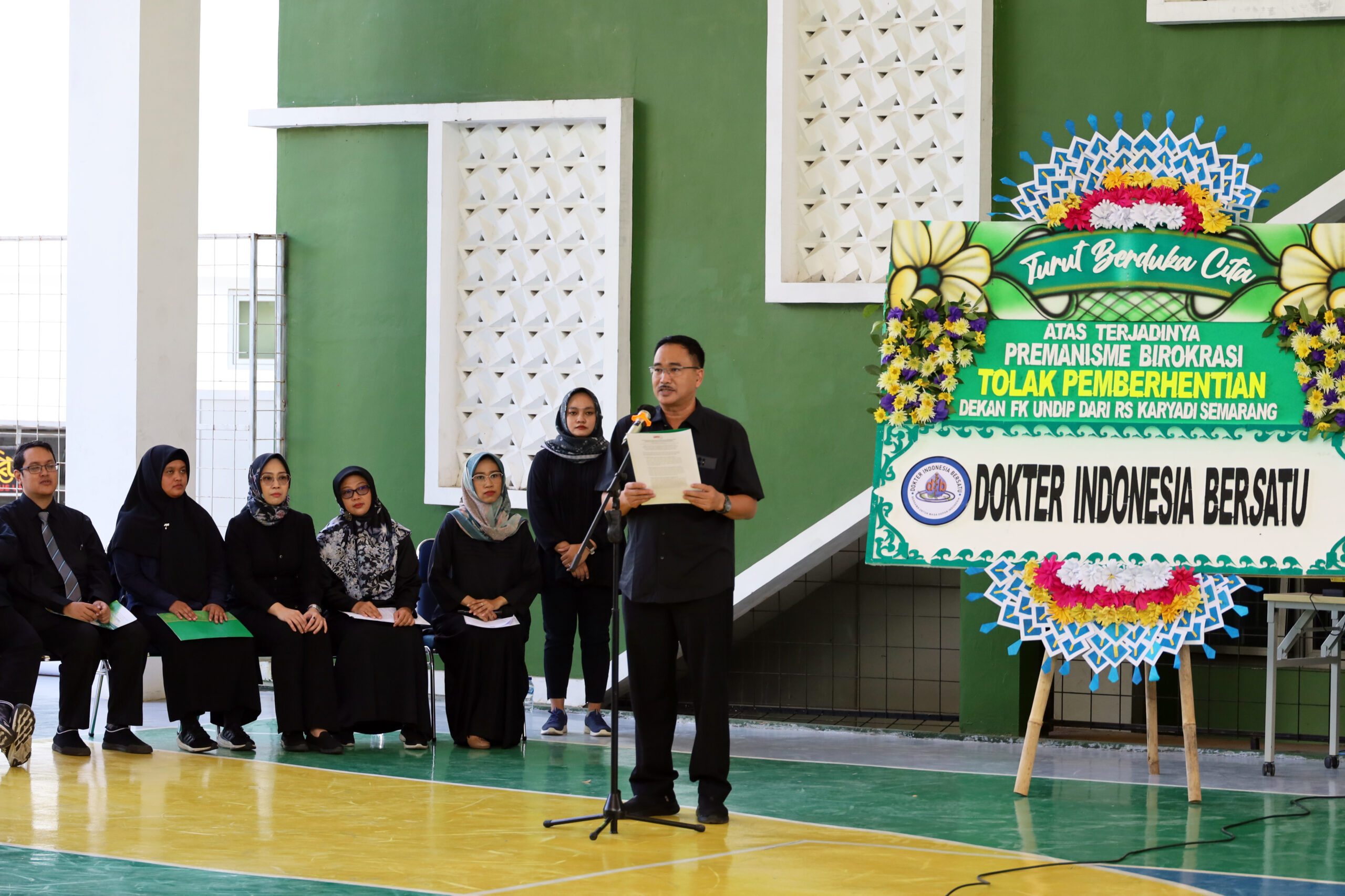 The entire academic community (professors, lecturers, PPDS students) and alumni of the Faculty of Medicine UNDIP, all dressed in black or dark clothing with black ribbons, loudly proclaimed, “We Stand with Dr. Yan Wisnu Prajoko.” (DHW & Titis – Public Relations)