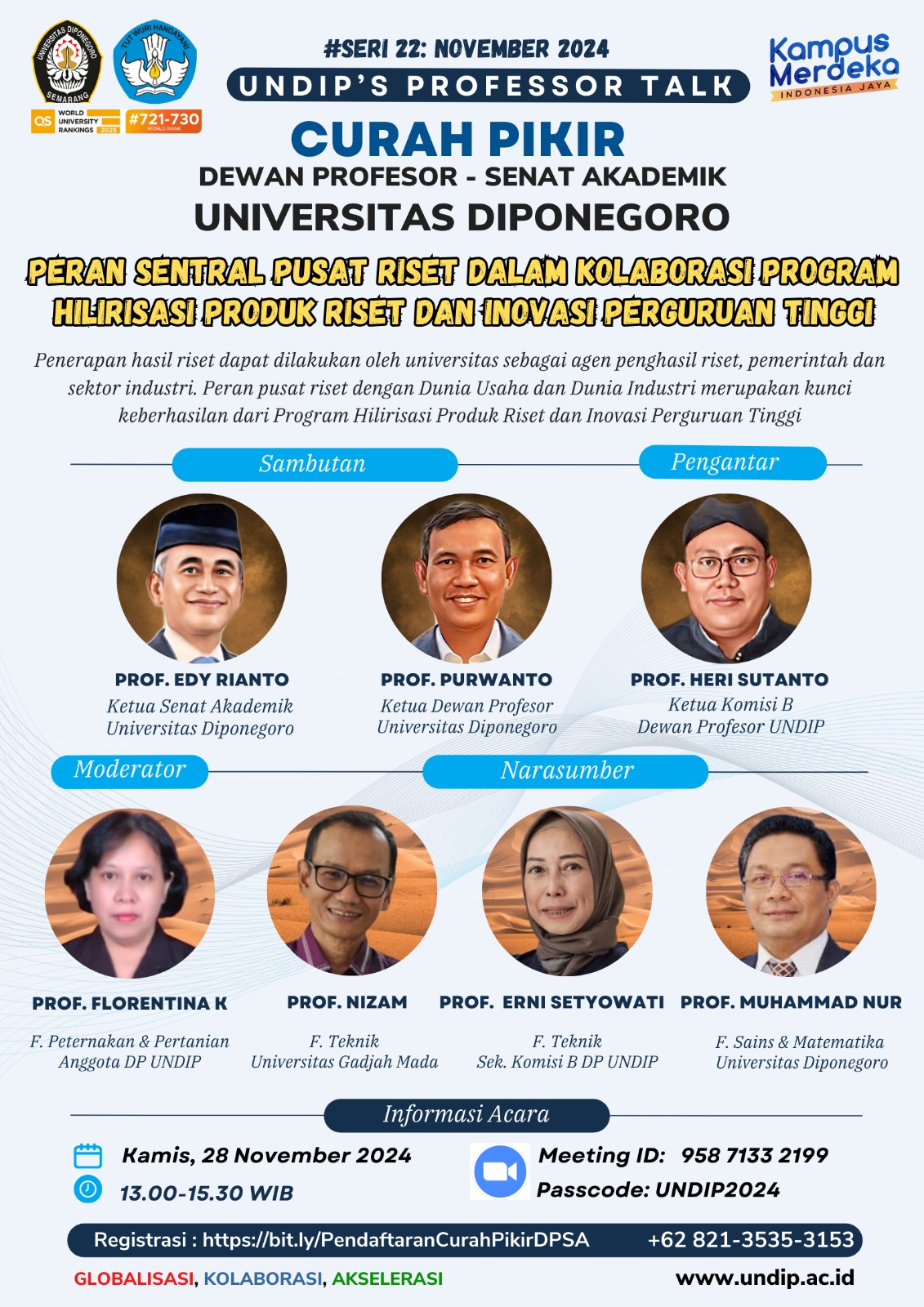The Academic Senate Professors’ Council of Universitas Diponegoro (UNDIP) held a webinar titled “UNDIP’s Professor Talk: Brainstorming by the Academic Senate Professors’ Council of Universitas Diponegoro” on Thursday, November 28, 2024, at 13:00 WIB. The event was conducted virtually via Zoom meeting and live-streamed on the official UNDIPTV YouTube channel. The theme of the webinar was “The Central Role of University Research Centers in Advancing Research Product Downstreaming and Innovation.”