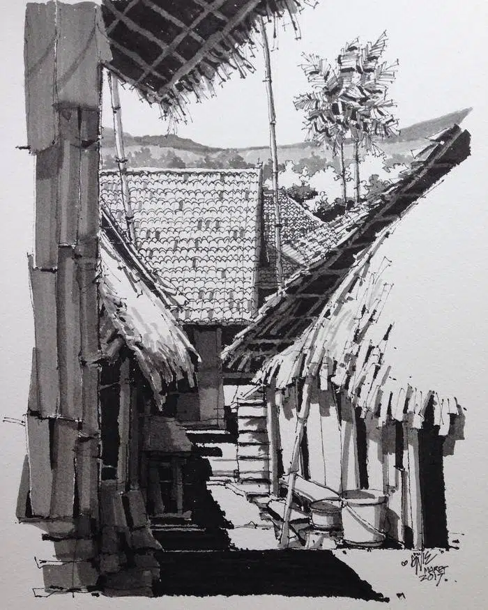Dr. Agung is also active in sketching communities and has produced over 700 sketches. One of his favorite masterpieces is a sketch of a traditional Sasak house, which he believes effectively captures the atmosphere through the play of shadow and accurate architectural detailing.