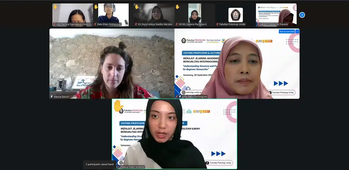 UNDIP, Semarang, (30/9) – Fakultas Psikologi Universitas Diponegoro mengadakan rangkaian kegiatan internasionalisasi melalui skema World Class University 2025 Visiting Lecturer dengan tema ‘Merajut Jejaring Akademik Global Melalui Penulisan Ilmiah Berkualitas Internasional’ dengan mengundang akademisi dari Virthulab, University of Florence, Italia, yaitu Marina Baroni, Ph.D. pada Selasa, 30 September 2025.