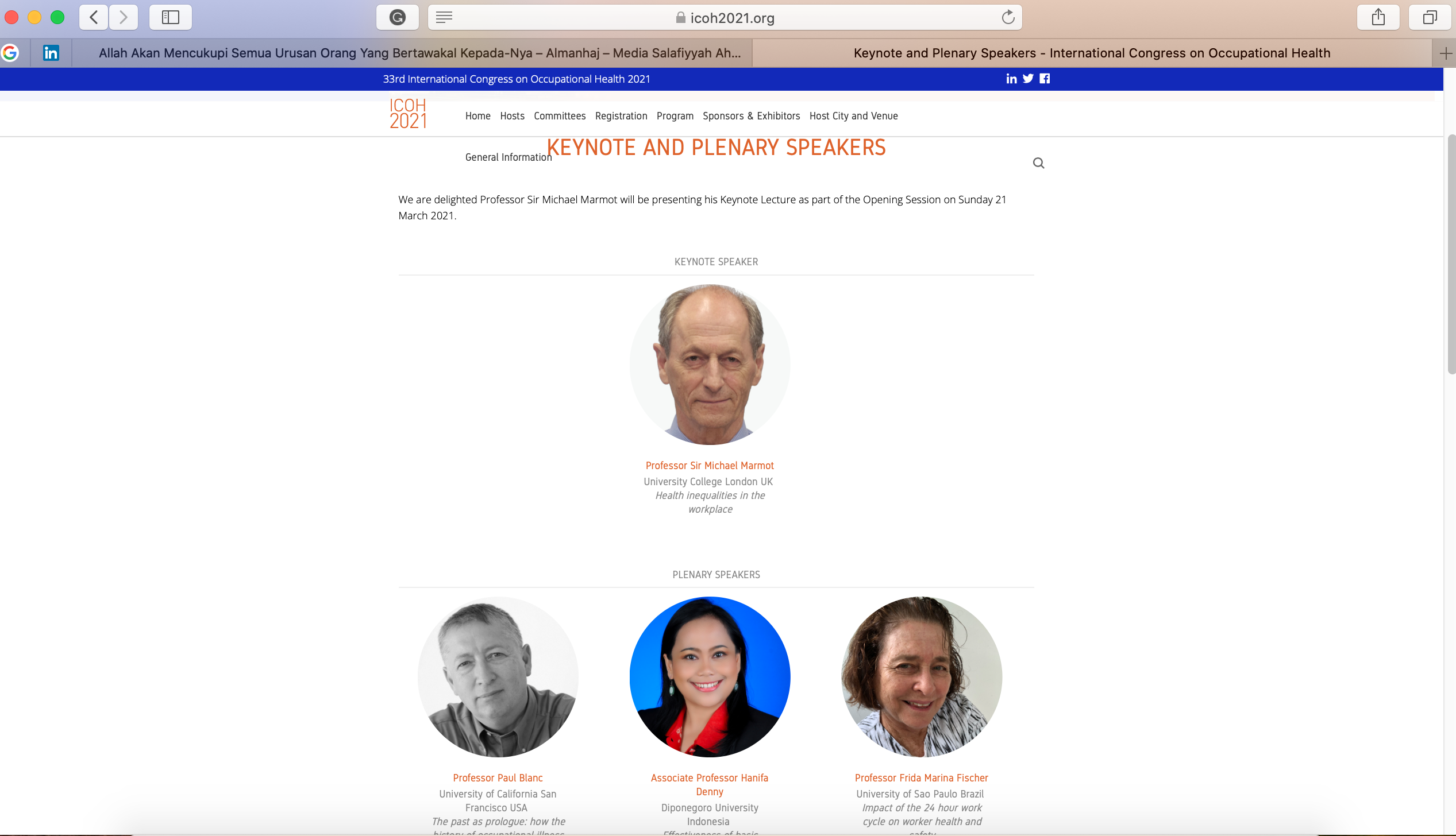 Hanifa M. Denny, SKM, MPH, Ph.D. di undang sebagai salah satu Plennary Speakers pada ICOH Congress, Melbourne 21-26 Maret 2021. ICOH adalah Komisi Internasional tentang Kesehatan Kerja yang merupakan organisasi profesional non-pemerintah di tingkat internasional yang bertujuan untuk mendorong kemajuan ilmiah, pengetahuan dan pengembangan kesehatan dan keselamatan kerja dalam semua aspeknya. Didirikan pada tahun 1906 di Milan sebagai Komisi Permanen untuk Kesehatan Kerja. ICOH adalah tempat bergabungnya masyarakat ilmiah internasional terkemuka dunia di bidang kesehatan kerja dengan keanggotaan 2.000 profesional dari 105 negara. ICOH diakui oleh PBB sebagai organisasi non-pemerintah (LSM) dan berkolaborasi dengan ILO dan WHO. Di antara berbagai kegiatan ICOH, ICOG Congress adalah kegiatan yang secara periodik diadakan tiap tiga tahunan atau “Trinneal,” dan biasanya di hadiri lebih dari 3000 delegasi bahkan pada beberapa periode kongres pernah mencapai 5000 peserta.