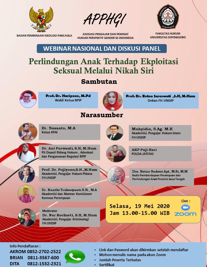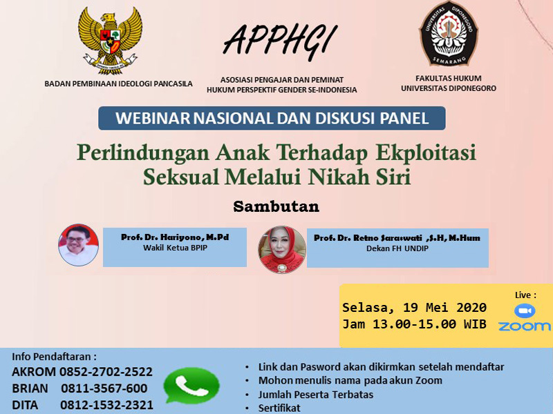 Fakultas Hukum Undip bekerjasama dengan Badan Pembinaan Ideologi Pancasila (BPIP) dan Asosiasi Pengajar dan Peminat Hukum Perspektif Gender Se-Indonesia (APPHGI) siap menggelar Webinar Nasional dan Diskusi Panel bertajuk “Perlindungan Anak terhadap Eksploitasi Seksual melalui Nikah Siri”. Acara akan digelar pada Selasa (19/5) mendatang via live zoom. Acara akan diawali dengan sambutan Prof. Dr. Hariyono,M.Pd.,selaku Wakil Ketua BPIP dan Dekan FH Undip,Prof. Dr. Retno Saraswati,SH.,M.Hum.Akan hadir sebagai Narasumber yakni Dr. Susanto,MA (Ketua KPAI), Dr. Ani Purwanti,SH.,M.Hum. (Plt. Deputi Bidang Hukum,Advokasi dan Pengawasan Regulasi BPIP, Prof. Dr. Pujiono, SH., M.Hum. (Akademisi, Pengajar Hukum Pidana FH), Dr. Kunthi Tridewiyanti, SH., MA (Akademisi dan mantan Komisioner Komnas Perempuan), Muhyidin, S. ag., MH (Akademisi, Pengajar Hukum Islam FH), AKP Puji Hari (Polda Jateng) dan Dra. Retno Sudewi,Apt,M.Si.,MM. (Kadis Pemberdayaan dan Perlindungan Anak Prov. Jateng).