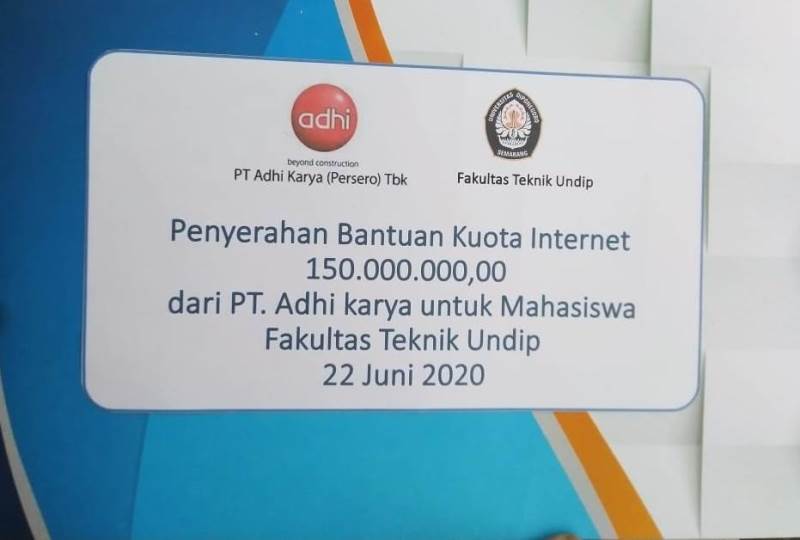 Kondisi ini menarik perhatian dari jajaran PT. Adhi Karya untuk memberikan bantuan kepada para mahasiswa Undip. Melalui penggunaan dana THR Direksi & Komisaris PT. Adhi Karya (Persero),Tbk, maka sebagian dana tersebut yaitu sebesar Rp. 150.000.000,00 (seratus lima puluh juta rupiah) dialokasikan kepada mahasiswa Fakultas Teknik Undip yang tergolong tidak mampu dan mengalami kesulitan karena membutuhkan biaya untuk pembelian pulsa kuota internet.