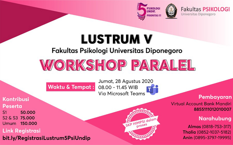 Fakultas Psikologi Universitas Diponegoro akan merayakan Lustrum V pada bulan Agustus mendatang. Dalam rangka merayakan Lustrum V, Fakultas Psikologi Undip menyelenggarakan Workshop Paralel dengan menghadirkan pakar psikologi dari berbagai universitas di Indonesia. Terdapat lima narasumber yang akan mengusung tema masing-masing terkait dengan psikologi.