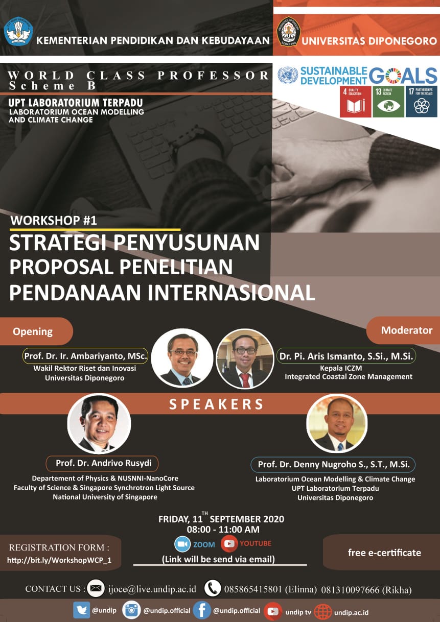 Workshop Strategi Penyusunan Proposal Penelitian Pendanaan Internasional yang diselenggarakan oleh Laboratorium Ocean Modelling and Climate Change – UPT Laboratorium Terpadu, Universitas Diponegoro yang merupakan rangkaian kegiatan World Class Professor Scheme B yang dilaksanakan pada: