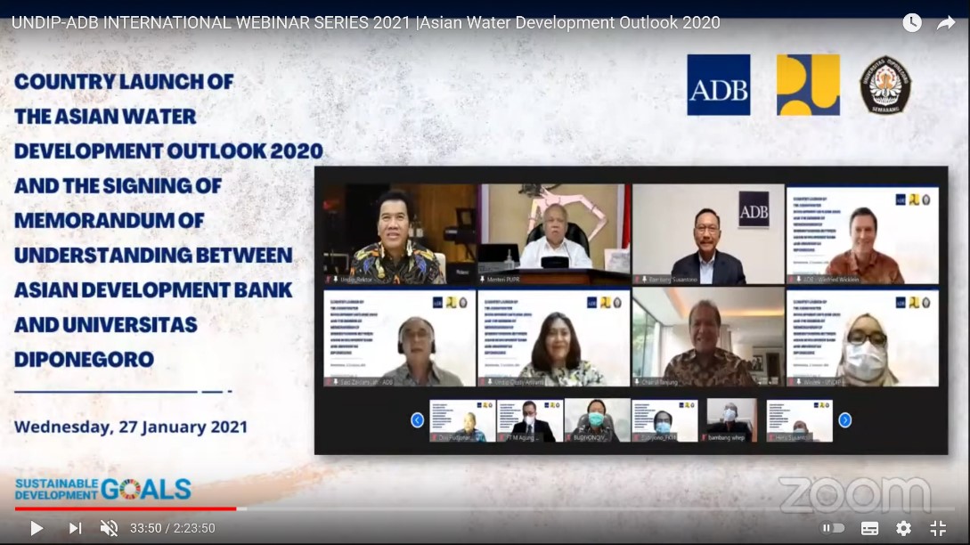 Selasa, 23 Februari 2021 UNDIP-ADB-Kementerian PUPR (Pekerjaan Umum dan Perumahan Rakyat) kembali mengadakan webinar dengan tajuk “Asian Water Development Outlook 2020” untuk meningkatkan pemahaman ketahanan air dalam skenario pembangunan berkelanjutan (AWDO-KolaborasiPUPRdenganADBdanUNDIP.go.id). Kegiatan terdiri dari 2 (dua) sesi, sesi pertama “Application AWDO in Policy Context” berisi penyampaian perkembangan serta capaian AWDO di Thailand dan Karnataka-India, dilanjutkan sesi kedua “AWDO Key Dimension on Urban Water Security” yang membahas secara detail manajemen ketahanan air Australia dengan AWDO dan manajemen ketahanan air di Kota Semarang-Indonesia. Informasi pada keseluruhan webinar disampaikan secara detail merujuk pada pengalaman empiris implementasi AWDO di negara-negara Asia. Penyampaian masalah terkait air yang dihadapi negara di Asia dan upaya penanganan yang telah dilakukan bersama AWDO menunjukkan keberhasilan dan kemajuan manajemen pengelolaan air, inovasi manajemen tata kelola serta kebijakan terus diupayakan sejalan dengan peningkatan masalah perubahan tata guna lahan sebagai tantangan pembangunan setiap negara.
