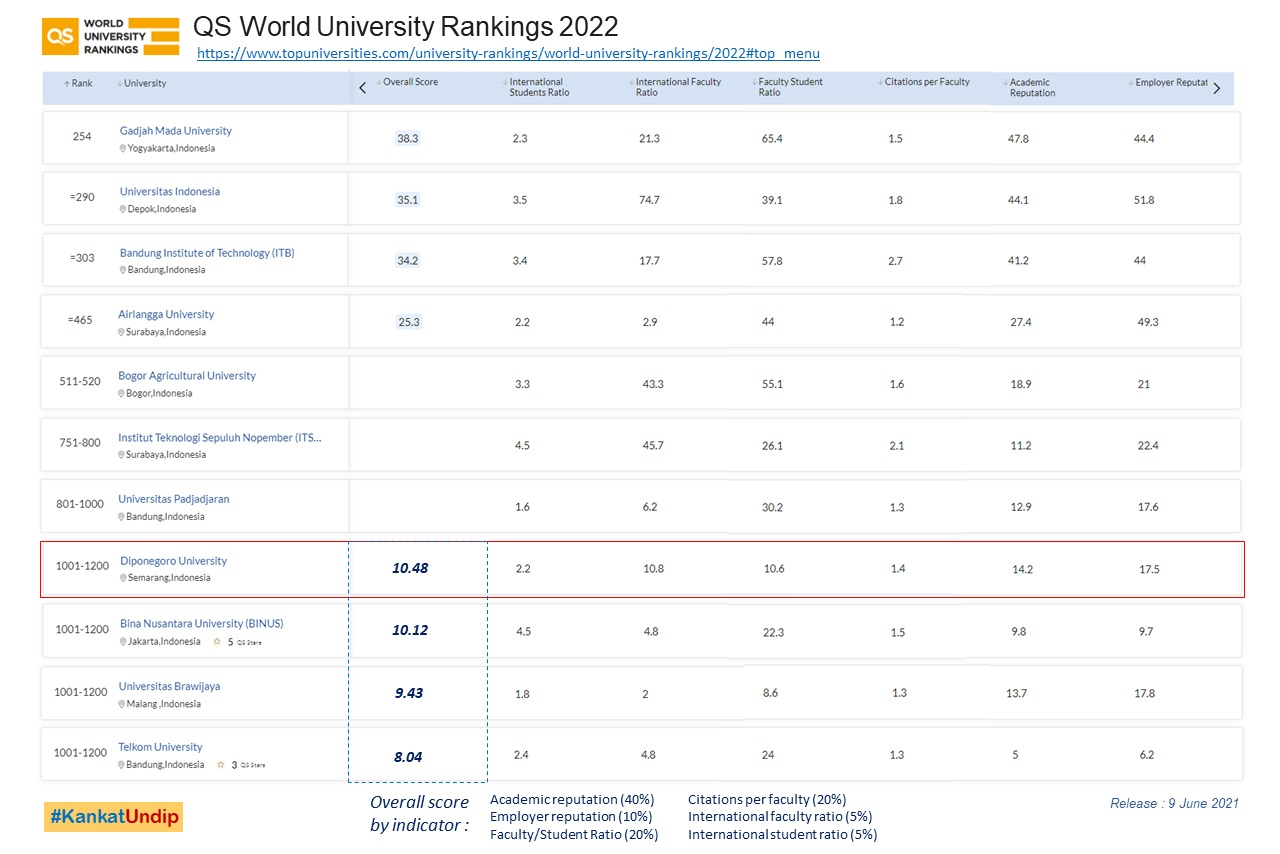 Untuk Undip sendiri hasil perhitungan QS World University Rankings 2022 berdasarkan data dari masing-masing indikator, adalah sebagai berikut: Academic reputation (14,2), Employer reputation (17,5), Faculty/Student Ratio (10,6), Citations per faculty (1,4), International faculty ratio (10,8), International student ratio (2,2). Sehingga hasil perhitungan total skor Undip adalah 10,48. Menempatkan Undip berada pada urutan ke-8 secara nasional.