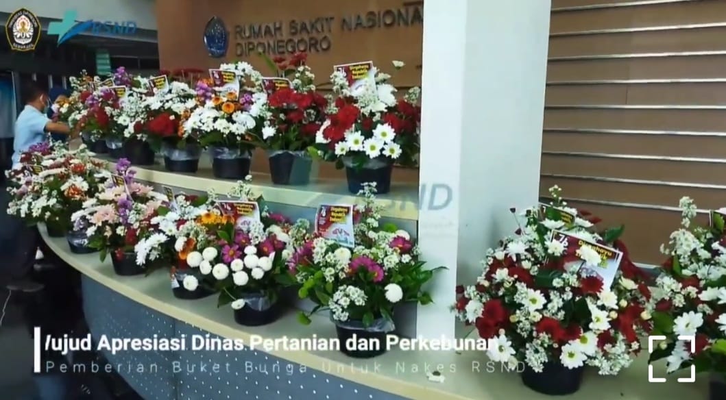 Dalam rangka wujud terima kasih dan apresiasi atas perjuangan tenaga kesehatan sebagai garda terdepan selama pandemi dan telah telah bekerja keras merawat pasien Covid-19, Dinas Pertanian dan Perkebunan Provinsi Jawa Tengah memberikan 30 buah buket bunga kepada nakes Rumah Sakit Nasional Diponegoro Universitas Diponegoro bertempat di Lobby RSND (12/8).