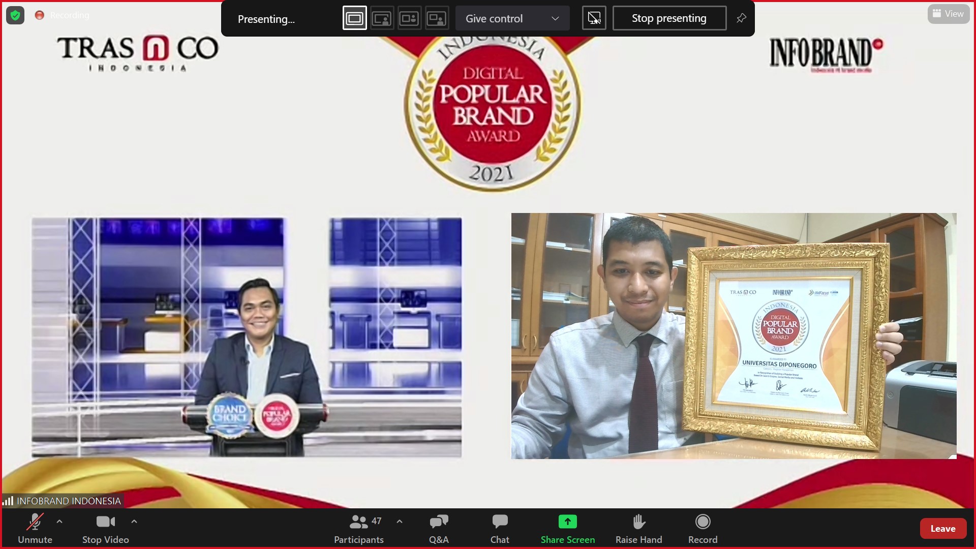 Program Studi S2 Manajemen, Fakultas Ekonomika dan Bisnis, Universitas Diponegoro kembali mendapatkan penghargaan Indonesia Digital Popular Brand Award di tahun 2021 di hari Kamis, 28 Oktober 2021. Penghargaan ini diberikan oleh INFOBRAND.ID bekerjasama dengan TRAS N CO Indonesia dan IMFocus Certified Google Partner, melakukan riset Indonesia Digital Popular Brand Index untuk meng-capture Brand-brand yang meraih popularitas tertinggi di kategori produk/jasanya sepanjang satu tahun terakhir.
