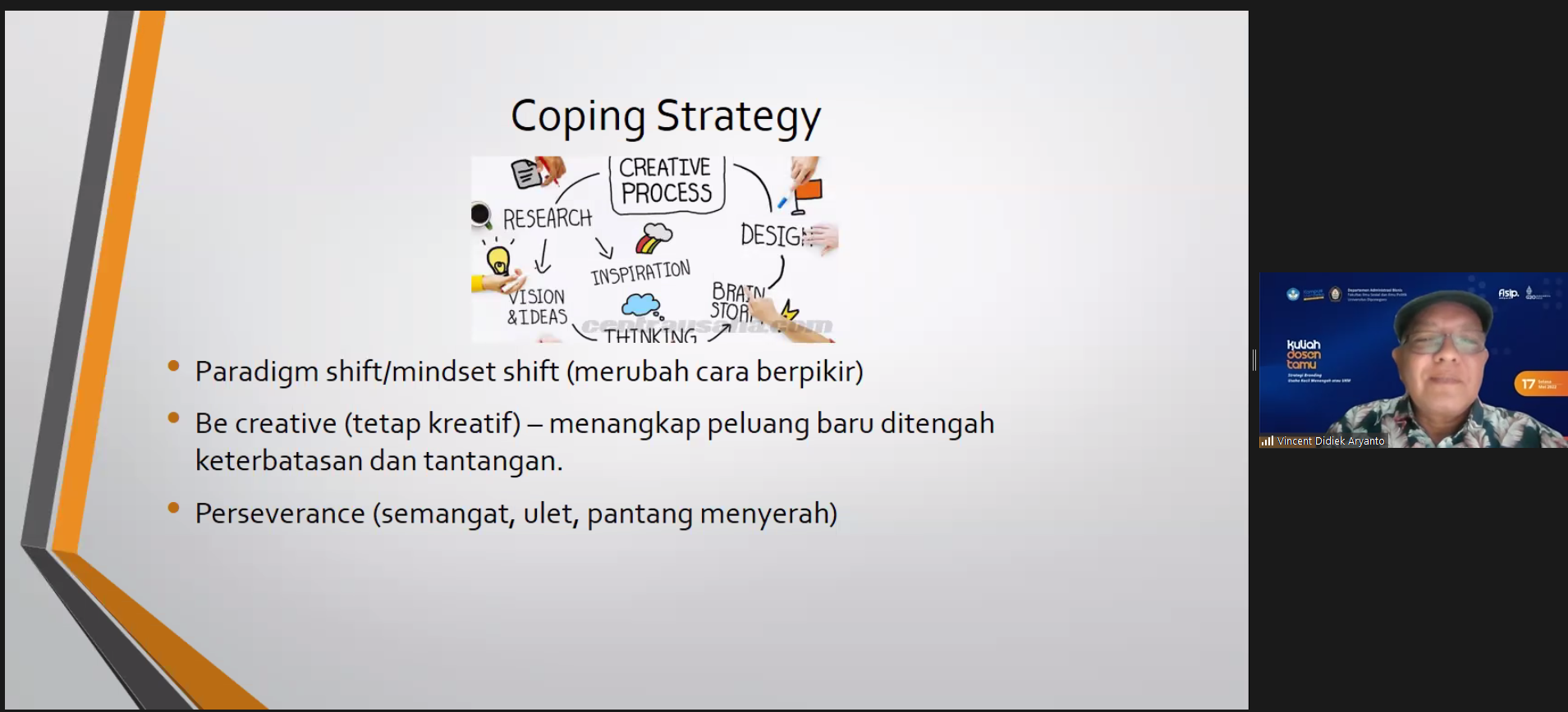 Ia juga menyampaikan beberapa cara yang ditempuh oleh UKM Online untuk penetrasi ke pasar global antara lain menjadi Seller di platform eCommerce Global, misalnya di Alibaba Group (Alibaba.com, Inamall.tmall.hk, Aliexpress), Ebay Global, Amazon Marketplace, dan Etsy. Atau menjual langsung ke negara target market melalui Facebook Pages dan FB Ads, Instagram dan IG Ads, website dan google, serta email marketing. Sementara Coping strategy yang dilakukan yaitu mengubah cara berpikir, menangkap peluang baru di tengah keterbatasan dan tantangan, serta semangat, ulet, dan pantang menyerah.