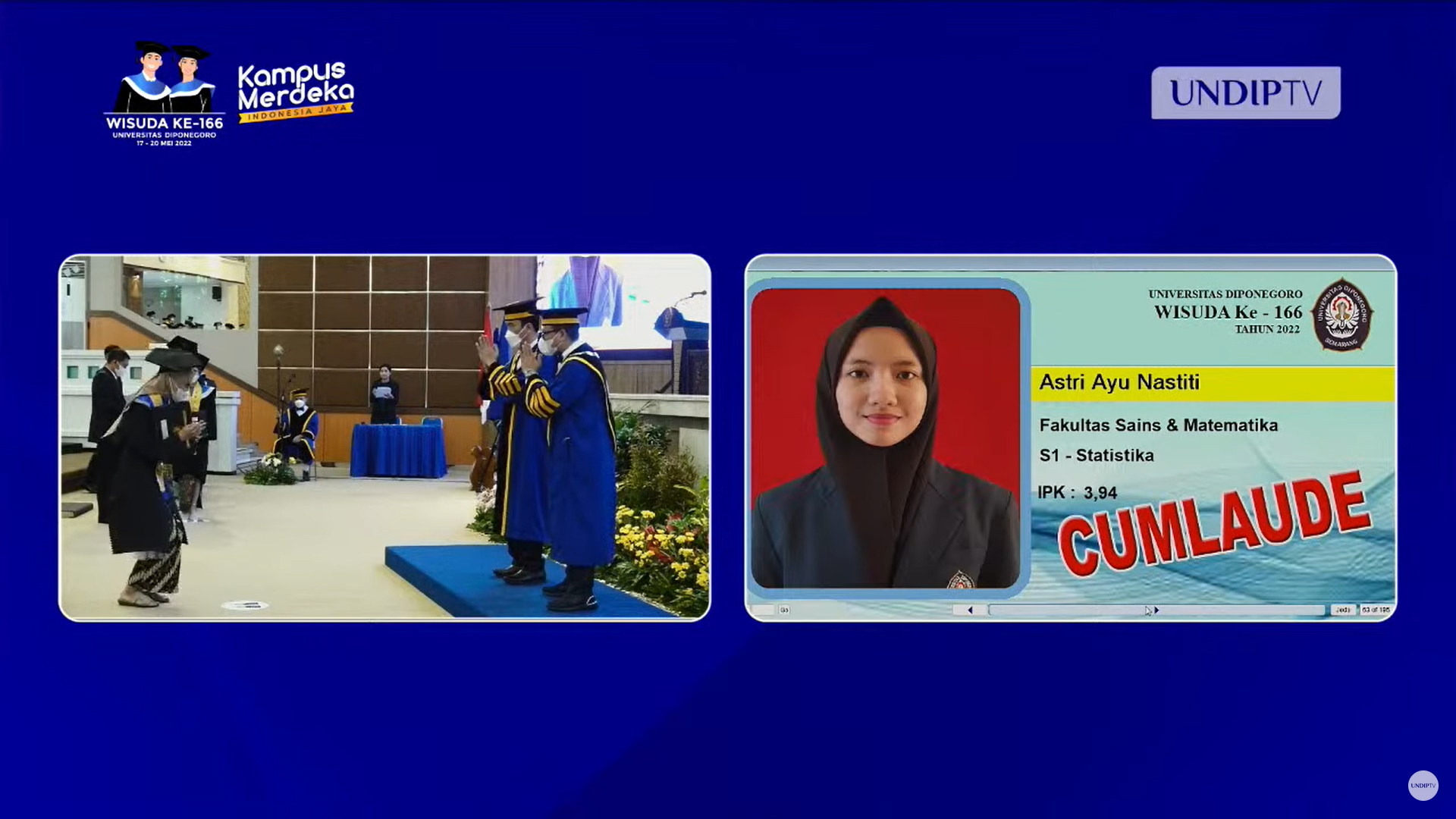Salah satu momen yang paling ditunggu-tunggu oleh mahasiswa yang telah menyelesaikan pendidikannya ialah momen saat upacara wisuda. Pengalaman suka dan duka saat menjalani perkuliahan akan terbayarkan ketika seorang wisudawan dilantik dalam upacara wisuda. Hal serupa yang tengah dirasakan oleh Astri Ayu Nastiti, wisudawan Bidikmisi yang lulus dengan predikat Cumlaude dari Fakultas Sains dan Matematika, Universitas Diponegoro (Undip).