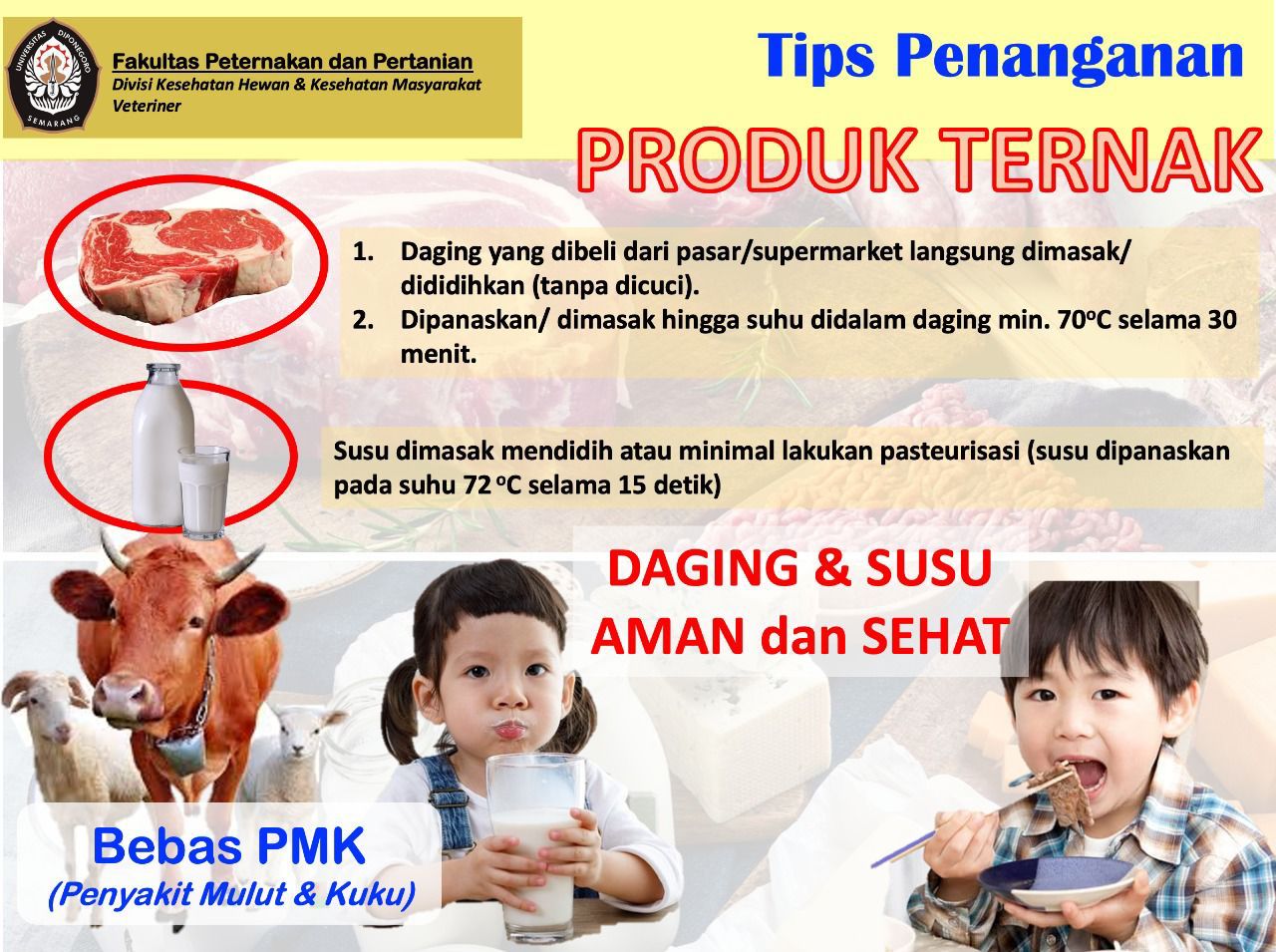 Dekan Fakultas Peternakan dan Pertanian Universitas Diponegoro,  Prof. Dr. Ir. Bambang WHEP, MS., M.agr membentuk Tim Satgas Pengendalian PMK UNDIP dengan  koordinator drh. Dian Wahyu Harjanti, Ph.D. Salah satu tupoksi Satgas PMK tersebut  adalah memberikan Edukasi mengenai PMK dan sosialisasi  kepada masyarakat bahwa PMK tidak ditularkan ke manusia (bukan penyakit zoonosis), dan daging serta susu aman untuk di konsumsi. Edukasi dan Sosialisasi kepada masyarakat tersebut dilaksanakan melalui forum temu virtual dengan peternak binaan FPP Undip dan masyarakat, serta melalui media social.