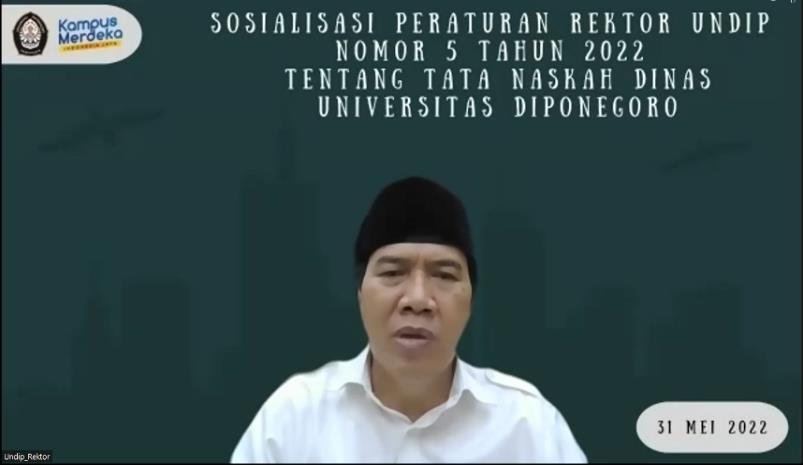 Bagian Hukum, Organisasi, Tata Laksana dan Tata Usaha (Hukortala&TU) Universitas Diponegoro menggelar Sosialisasi Peraturan Rektor Nomor 5 Tahun 2022 tentang Tata Naskah Dinas Universitas Diponegoro secara daring dengan platform zoom meeting pada pekan lalu. Acara dihadiri oleh Rektor Undip, Ketua Majelis Wali Amanat, Ketua Senat Akademik, para Wakil Rektor, para Dekan Fakultas dan Sekolah serta Pimpinan Unit Kerja di lingkungan Undip beserta staf.