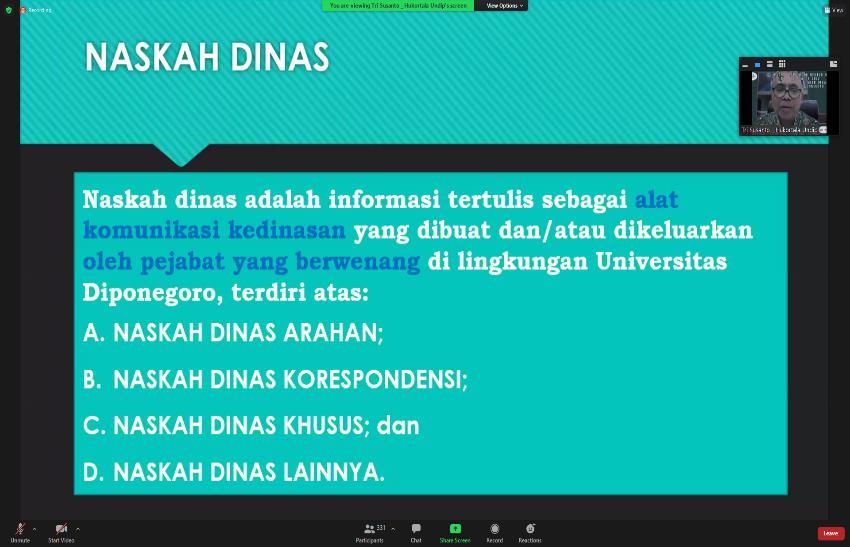 Sekilas dari pemaparan materi oleh Tri Susanto, S.H. selaku narasumber sekaligus sebagai manager bagian Hukum, Organisasi, Tata Laksana dan Tata Usaha menyebutkan bahwa pengertian naskah dinas mengacu pada peraturan kemendikbud no 3 tahun 2021, merupakan informasi tertulis sebagai alat komunikasi kedinasan yang dibuat dan/ atau dikeluarkan oleh pejabat yang berwenang di lingkungan Universitas Diponegoro. Naskah dinas terbagi menjadi 4 bagian diantaranya naskah dinas arahan, naskah dinas korespondensi, naskah dinas khusus dan naskah dinas lainnya. Naskah dinas arahan meliputi naskah dinas pengaturan (nomenklaturnya ada 4 yakni peraturan, instruksi, standar operasional prosedur dan surat edaran); selanjutnya ada naskah dinas penetapan dan naskah dinas penugasan. Sedangkan naskah dinas korespondensi diantaranya dibagi menjadi 3 nomenklatur yakni nota dinas, surat dinas, dan surat undangan. Untuk naskah dinas khusus ada 9 nomenklatur diantaranya nota kesepahaman, perjanjian kerjasama dalam negeri, surat kuasa, berita acara, surat keterangan, surat pernyataan, surat pengantar, pengumuman dan perjanjian internasional. Untuk naskah dinas lainnya meliputi notula, laporan, telaahan staf, sertifikat dan piagam. (Diah-Humas)