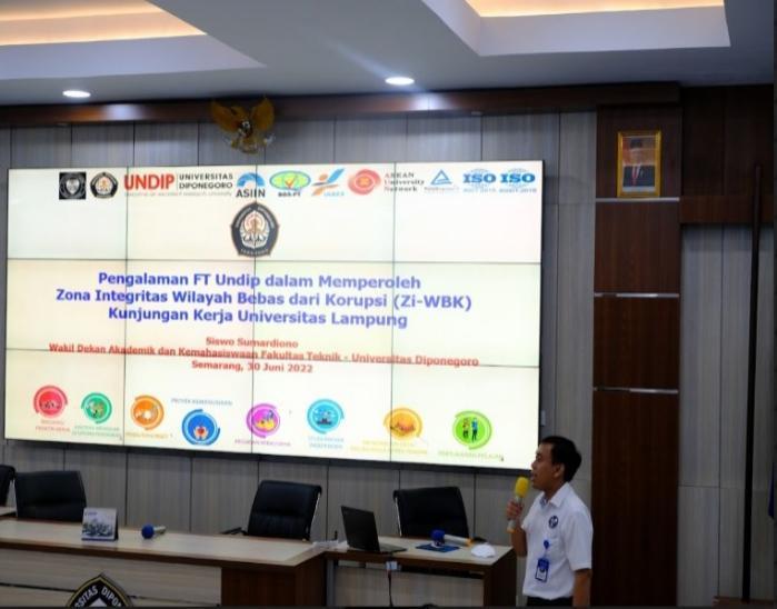 Merupakan suatu kebanggaan Fakultas Teknik Universitas Diponegoro (FT Undip) dapat berbagi pengalamannya atas predikat Zona Integritas Wilayah Bebas dari Korupsi (ZI-WBK) dari Kementerian Pendayagunaan Aparatur Negara dan Reformasi Birokrasi bersama dengan 11 Perguruan Tinggi Negeri (PTN) dan Lembaga Layanan Pendidikan belum lama ini. Salah satunya saat menjadi tuan rumah dan menerima kunjungan kerja dari Universitas Lampung (Unila) dengan memberikan pendampingan mengenai implementasi ZI-WBK dalam rangka menuju Zona Integritas Wilayah Birokrasi Bersih dan Melayani (ZI-WBBM) di lingkungan Fakultas Teknik Tahun 2022 bertempat di Gedung Dekanat Ruang Teater lantai 4 (Kamis, 30/6).