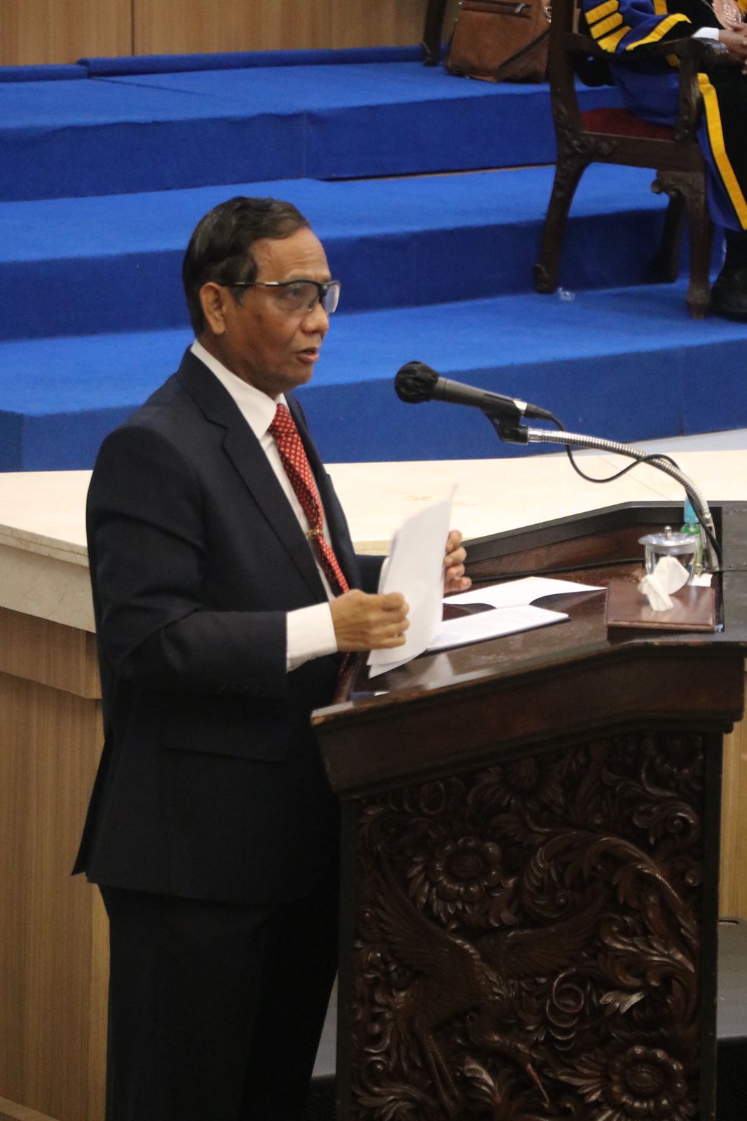 Mengawali orasi ilmiah, Prof. Dr. Moh. Mahfud MD, S.H. menyampaikan bahwa usia 65 tahun merupakan capaian penting dan berarti bagi Undip. Selama 65 tahun, Undip telah berkontribusi menjalankan salah satu amanat konstitusional UUD 1945, yakni turut mencerdaskan kehidupan bangsa. Selama 65 tahun, Undip telah menjalani kiprah mulia sebagai simpul dan pilar utama pembangunan di bidang pendidikan. Dan selama 65 tahun, Undip telah menghasilkan banyak alumni yang berkualitas dan berintegritas.