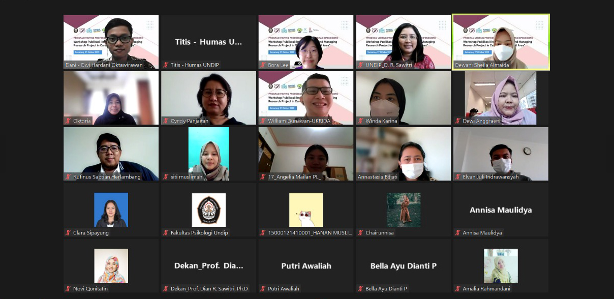 Fakultas Psikologi Universitas Diponegoro (Undip) bersama dengan Center for Career and Capacity Development Studies (CAREERS) Undip aktif menjalankan program Undip dalam upaya menjadi World Class University, salah satunya yaitu program Visiting Professor. Dalam program Visiting Professor ini, Fakultas Psikologi Undip menggelar Workshop Publikasi Ilmiah bertema “Planning and Managing Research Project in Career Development Area” secara online melalui Zoom meeting pada Kamis, 27 Oktober 2022 pukul 13:00-15:00 WIB. Terdapat dua pembicara yang hadir sebagai narasumber yaitu Prof. Bora Lee, Ph.D dari Korea University, Korea Selatan dan William Gunawan, S.Psi., M.Min., M.Si., Ph.D dari Universitas Kristen Krida Wacana yang juga merupakan Postdoctoral Fellow di Fakultas Psikologi Undip.