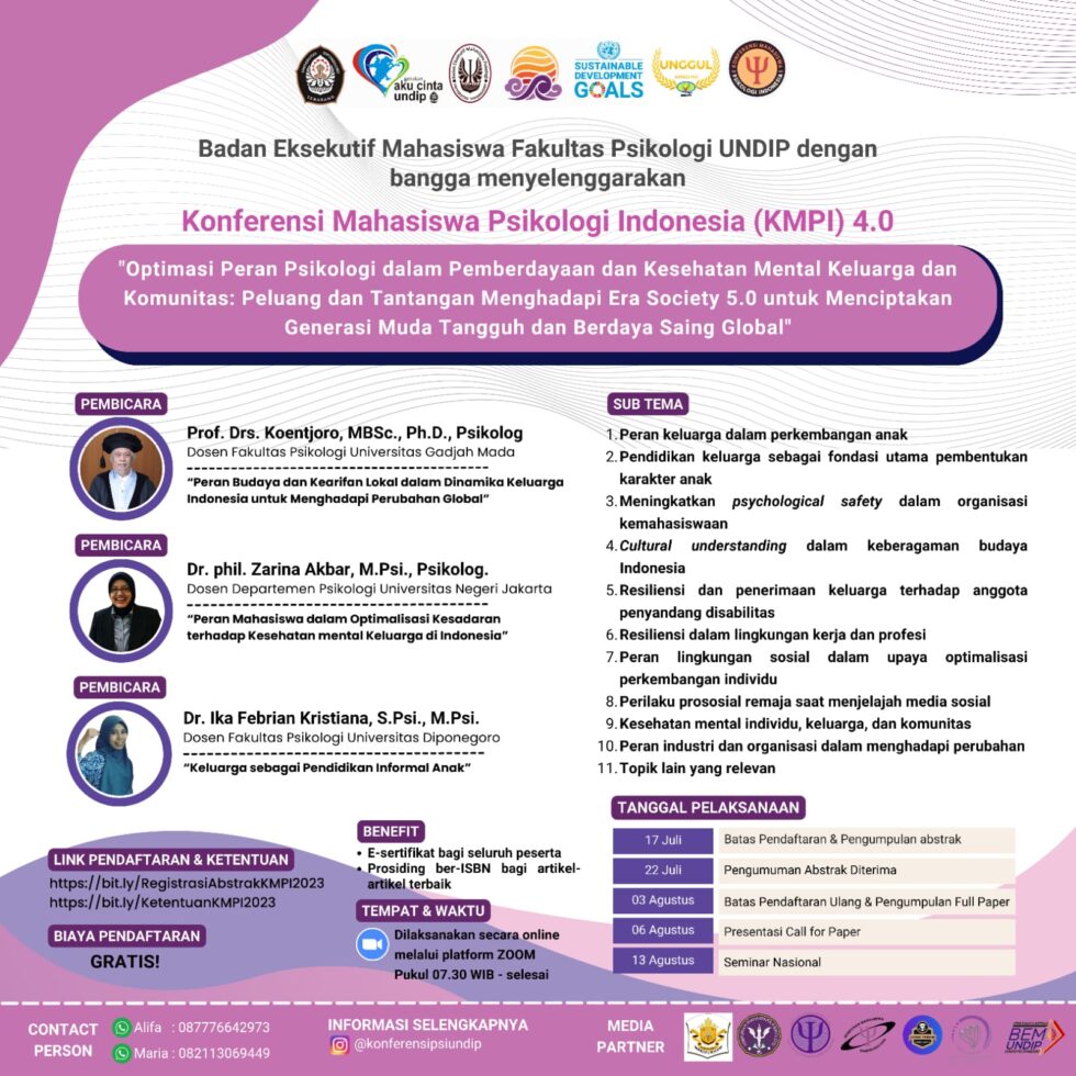 Konferensi Mahasiswa Psikologi 4.0 akan dilaksanakan pada tanggal 6 & 13 Agustus 2023 yang melibatkan seluruh mahasiswa Psikologi se-Indonesia.