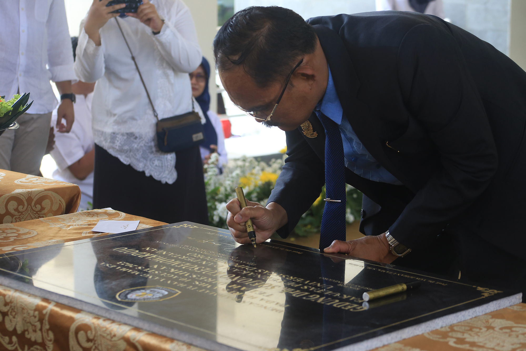 Dilanjutkan, Prof. Dr. Hj. Wuryanti Koentjoro, M.M. selaku ahli waris dari drh. Soejono Koesoemowardojo bersama Rektor Undip memotong pita sebagai simbol bahwa gedung baru FPP undip ini sudah resmi bisa dimanfaatkan untuk mahasiswa dan semua civitas academica. Di akhir sesi Dr. Ir. Henny Rizqiati, S.Pt., M.Si. selaku Ketua Panitia Peresmian Gedung juga tidak henti mengingatkan jika gedung ini adalah simbol dari nafas baru, semangat baru, dan upaya nyata dalam mendukung proses belajar mengajar. “Dengan adanya gedung ini diharapkan mahasiswa bisa lebih bangga, lebih giat, dan lebih memiliki sense dalam mewujudukan bangunan yang berkonsep green building. Mengingat gedung ini dikelilingi oleh greenhouse melon dan lahan praktikum bagi mahasiswa”, pungkasnya.