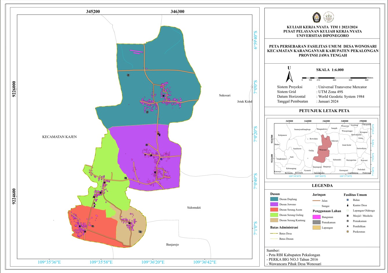 Fasilitas umum merupakan sarana yang dapat dimanfaatkan oleh publik. Untuk memberikan gambaran lokasi fasilitas umum yang ada di Desa Wonosari, Kecamatan Karanganyar, Kabupaten Pekalongan, Garin Aprilino Matondang mahasiswa Teknik Geodesi Universitas Diponegoro membuat peta persebaran fasilitas umum Desa Wonosari. Senin (5/02), mahasiswa KKN menyerahkan peta persebaran fasilitas umum.