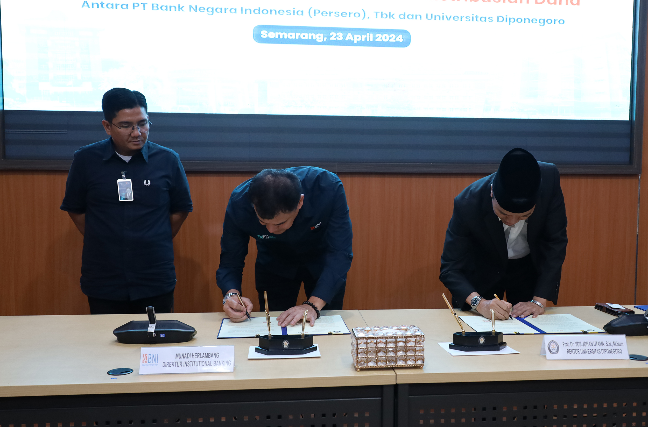 Kerja sama ditandai dengan penandatanganan nota kesepahaman antara UNDIP yang diwakili oleh Rektor UNDIP Prof. Dr. Yos Johan Utama, S.H., M.Hum., dengan PT. Bank Negara Indonesia yang diwakili oleh Pemimpin Divisi Institutional Banking 2 BNI Efrizal, serta disaksikan oleh Direktur Institutional Banking BNI Munadi Herlambang.