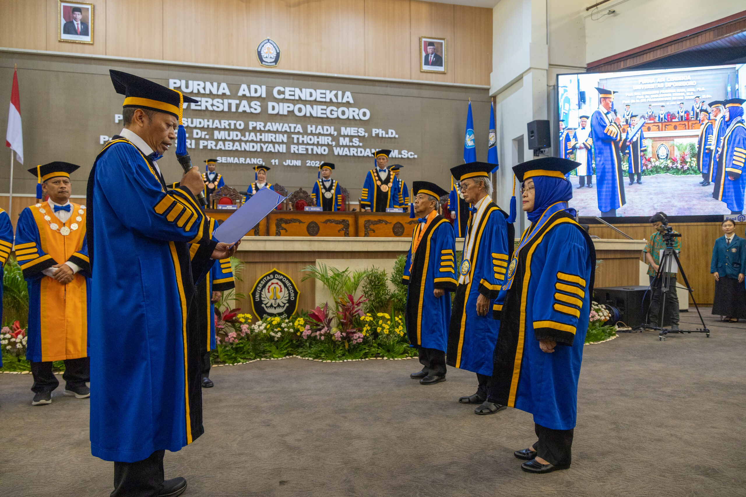 Universitas Diponegoro (UNDIP) menggelar upacara akademik Purna Adi Cendekia bertempat di gedung Prof Soedarto, SH kampus UNDIP Tembalang pada Selasa (11/6). Purna Adi Cendekia adalah bentuk penghargaan yang diberikan kepada guru besar yang telah resmi memasuki masa purna tugas. Untuk kesempatan ini, penghargaan diberikan kepada 3 (tiga) guru besar yakni: Prof. Drs. Sudharto P. Hadi, MES, Ph.D dari Fakultas Ilmu Sosial dan Ilmu Politik (FISIP); Prof. Dr. Mudjahirin Thohir, M.S. dari Fakultas Ilmu Budaya (FIB) dan Prof. Dr. Ir. Sri Prabandiyani Retno Wardani, M.Sc. dari Fakultas Teknik (FT).