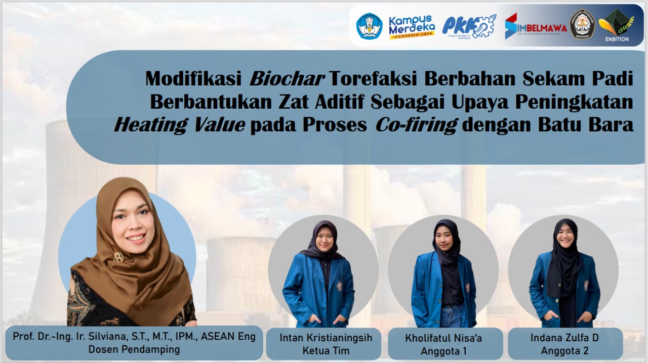 Tim yang terdiri dari Intan Kristianingsih, Kholifatul Aliyahtun Nisa’a, dan Indana Zulfa D dengan bimbingan dari Prof. Dr-Ing. Ir. Silviana, S.T., M.T., IPM, ASEAN Eng. ini mengembangkan cara untuk mengurangi penggunaan batu bara dengan menciptakan biomassa ramah lingkungan menggunakan proses co-firing.
