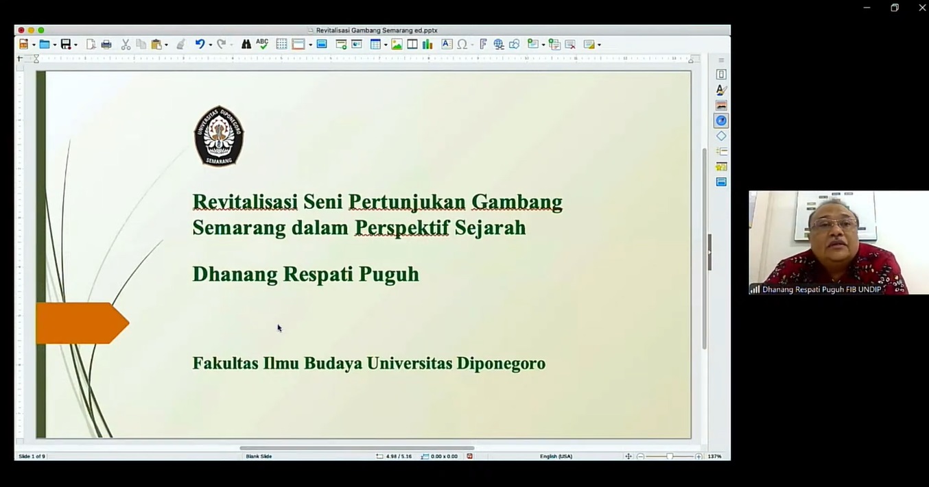 Webinar yang dimoderatori oleh Prof. Dr. Endang Susilowati, M.A. ini mengundang 3 (tiga) narasumber, yaitu Prof. Dr. Mustofa Agung Sardjono, IPU., Guru Besar dari Universitas Mulawarman yang menyampaikan materi tentang Sisipkan Nada dalam Data; Prof. Dr. dr. Hardhono Susanto, PAK Guru Besar dari Fakultas Kedokteran UNDIP yang menjelaskan tentang Hakikat Wayang dalam Tontonan dan Tuntunan; dan Prof. Dr. Drs. Dhanang Respati Puguh, M.Hum. Guru Besar dari Fakultas Ilmu Budaya UNDIP yang menyampaikan materi mengenai Revitalisasi Seni Pertunjukan.