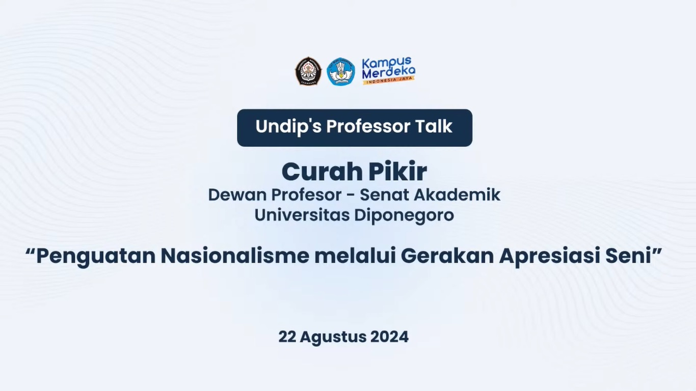 Dewan Profesor Senat Akademik Universitas Diponegoro (UNDIP) menyelenggarakan kegiatan Webinar “UNDIP’s Professor Talk” Curah Pikir Dewan Profesor Senat Akademik Universitas Diponegoro pada Kamis, 22 Agustus 2024 pukul 13.00 WIB secara daring melalui Zoom meeting dan disiarkan secara langsung melalui Official Youtube UNDIPTV dengan tema “Penguatan Nasionalisme melalui Gerakan Apresiasi Seni”.