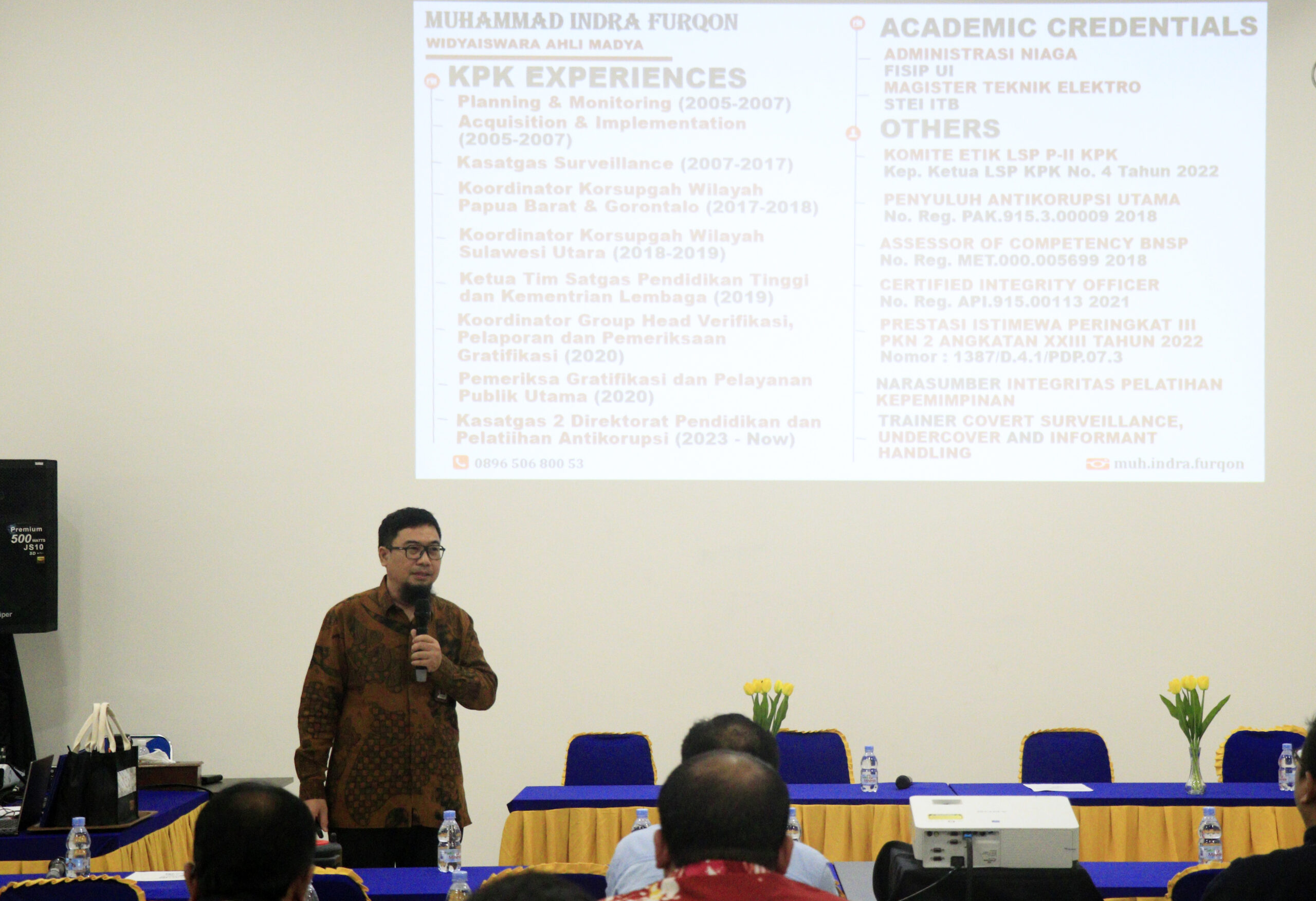 Hadir sebagai narasumber dari KPK RI, Muhammad Indra Furqon, Widyaiswara Ahli Madya KPK RI, Direktorat Pendidikan dan Pelatihan Antikorupsi, menyampaikan materi berjudul “Membangun Integritas dan Budaya Anti Grafitikasi”. Ia menyebutkan definisi dan bentuk gratifikasi menurut Penjelasan Pasal 12B Undang-Undang Nomor 20 tahun 2001 adalah pemberian dalam arti luas meliputi: uang, barang, rabat, komisi, pinjaman tanpa bunga, tiket perjalanan, fasilitas penginapan, perjalanan wisata, pengobatan cuma-cuma, fasilitas lainnya. Dijelaskan pula unsur pidana berkaitan dengan gratifikasi kepada pegawai negeri atau penyelenggara negara yakni UU nomor 20 tahun 2001 pasal 12B ayat 1 dan 12B ayat 2.