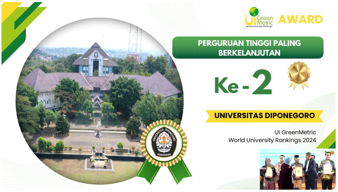 Universitas Diponegoro (UNDIP) kembali dinobatkan menjadi The 2nd Most Sustainable University di Indonesia oleh pemeringkatan UI GreenMetric World University Rankings 2024. Di tingkat Asia UNDIP mendapatkan ranking ke-4, sementara di tingkat Internasional mendapat ranking ke-26.
