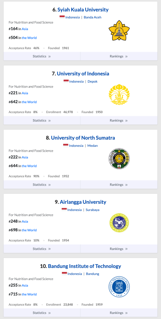 Di Indonesia, posisi pertama dalam pemeringkatan EduRank untuk bidang Nutrition and Food Science dipegang oleh Institut Pertanian Bogor (IPB), yang juga menunjukkan prestasi luar biasa dengan peringkat ke-35 di Asia dan ke-145 di dunia. Meskipun demikian, capaian UNDIP di peringkat kedua menjadi indikasi bahwa universitas ini mampu bersaing dengan universitas ternama lainnya dalam menghasilkan penelitian berkualitas dan lulusan yang kompeten di bidangnya. Peringkat ini juga menunjukkan bahwa dalam bidang Nutrition and Food Science UNDIP lebih unggul di bandingkan dengan Universitas terkemuka di Indonesia seperti Universitas Brawijaya, Universitas Gadjah Mada, dan Universitas Indonesia.