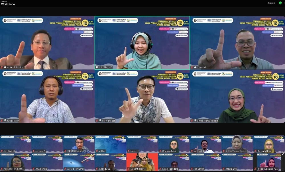 Diselenggarakan secara daring melalui platform Zoom meeting, webinar ini menjadi ruang belajar yang membuka wawasan tentang bagaimana teknologi, khususnya kecerdasan buatan (AI), bersinergi dengan metode PRISMA (Preferred Reporting Items for Systematic Reviews and Meta-Analyses) sebagai panduan internasional yang menjadi standar dalam penyusunan systematic review dan meta-analisis.