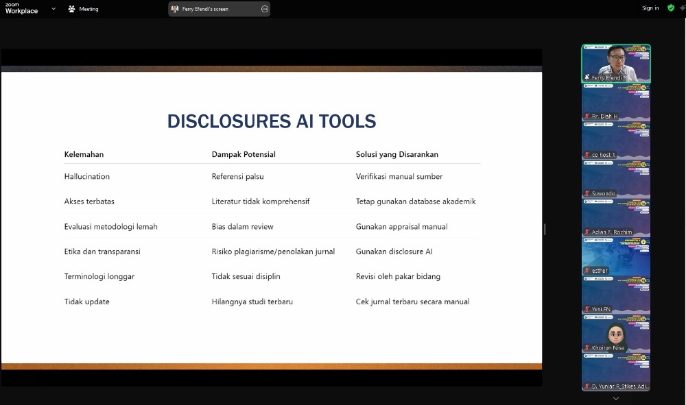 “AI bukan untuk menggantikan peneliti, melainkan memperkuat proses riset agar lebih efisien dan akurat. Namun, akuntabilitas dan prinsip transparansi dalam PRISMA harus tetap dijaga,” tegas Prof. Ferry.