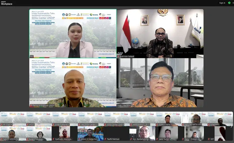 UNDIP, Semarang (21/06) – Universitas Diponegoro melalui SDGs Center menggelar Undip Sustainability Talks Seri 5 dalam format Webinar Nasional bertajuk “Satu Desa Satu Koperasi: Cetak Biru Koperasi Merah Putih untuk Ekonomi Inklusif” pada Jumat, 20 Juni 2025 secara daring melalui platform Zoom. Hadir dalam acara ini Budi Arie Setiadi, S.Sos., M.Si., Menteri Koperasi dan UKM Republik Indonesia yang menjadi keynote speaker membawakan tema tentang pentingnya koperasi dalam mendukung ekonomi di Indonesia.