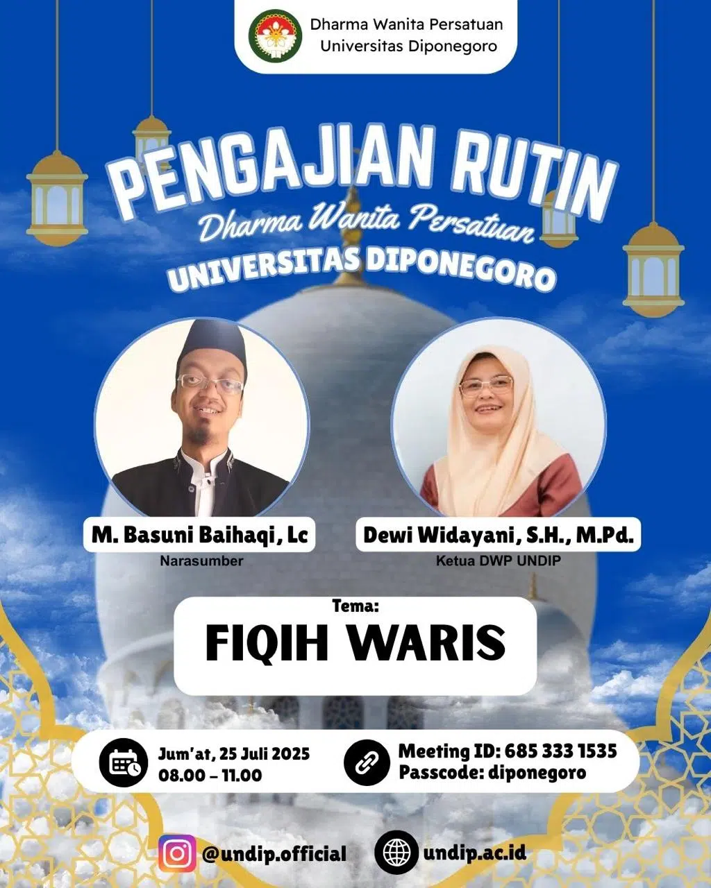 UNDIP, Semarang (25/07) – Dalam rangka meningkatkan pemahaman tentang pembagian waris, Dharma Wanita Persatuan (DWP) Universitas Diponegoro mengadakan kegiatan Pengajian mengangkat tema Fiqih Waris yang dilaksanakan secara daring melalui Zoom Meeting pada hari Jumat, 25 Juli 2025.