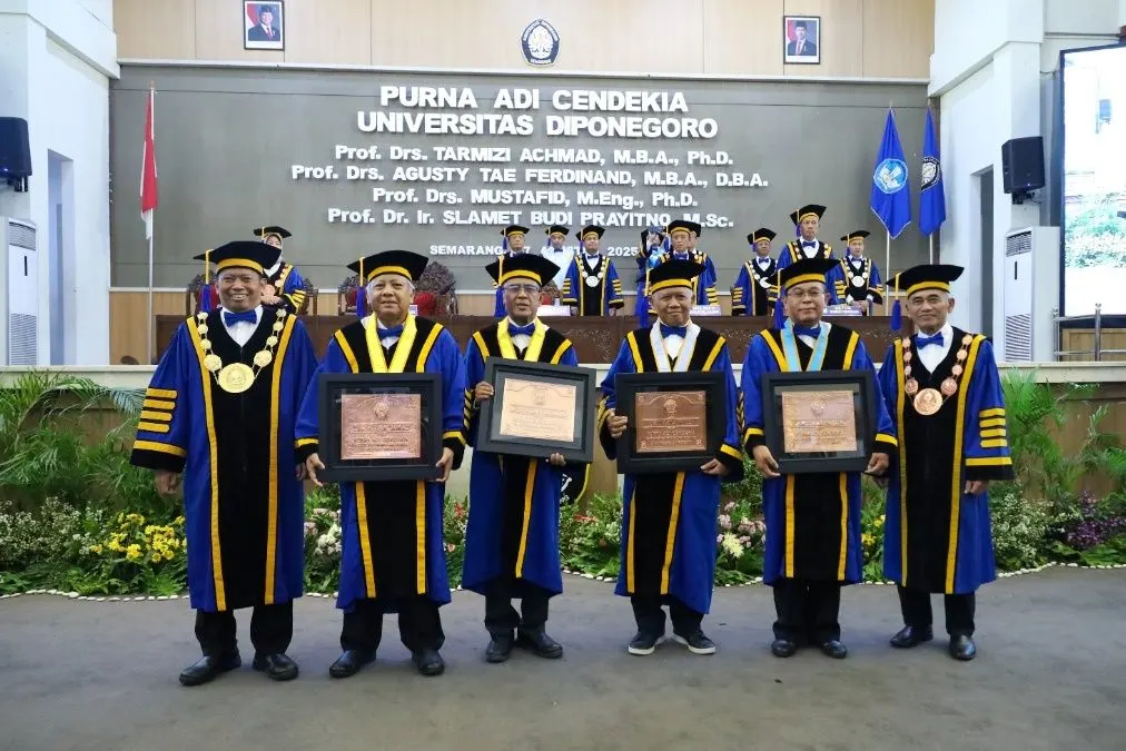 Prof. Suharnomo juga menekankan pentingnya riset yang tidak hanya berhenti di laboratorium, tetapi memberi manfaat nyata bagi masyarakat. Menutup sambutannya dengan penuh haru, berharap agar karya dan kebijaksanaan para Guru Besar terus menjadi warisan berharga yang patut diteladani, sekaligus pengingat bahwa ilmu dan pengabdian sejatinya harus membawa kemanfaatan sebesar-besarnya bagi manusia dan bangsa.