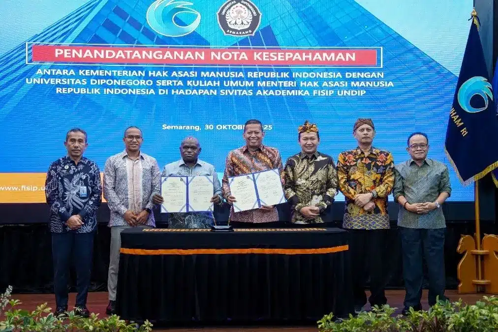 Dalam kesempatan tersebut, turut dilakukan penandatanganan Nota Kesepahaman antara UNDIP oleh Rektor UNDIP Prof. Dr. Suharnomo, S.E., M.Si. dan Kementerian HAM RI, Menteri Natalius Pigai tentang kerja sama di bidang pendidikan, penelitian, dan pengabdian kepada masyarakat, khususnya dalam pengarusutamaan HAM di perguruan tinggi. Inisiatif ini diprakarsai oleh Program Studi S1 Administrasi Bisnis FISIP UNDIP, dengan dukungan Direktorat Inovasi, Hilirisasi, dan Kerja Sama UNDIP.