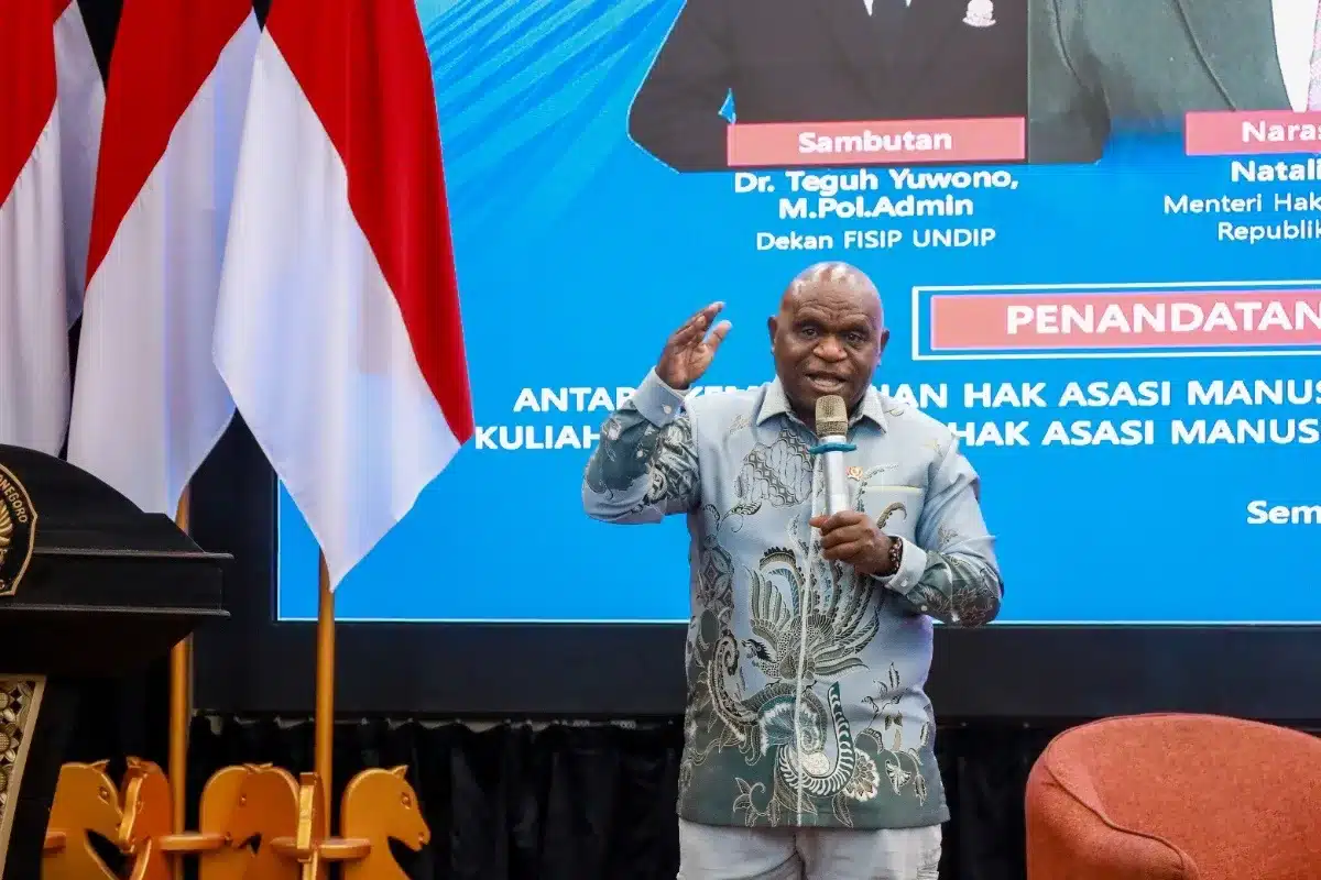 Sementara itu, Ketua Panitia sekaligus Kepala Departemen Politik dan Ilmu Pemerintahan FISIP UNDIP, Dr. Nur Hidayat Sardini, S.Sos., S.H., M.Si., dalam laporannya menyampaikan apresiasi atas dukungan penuh dari pimpinan universitas, fakultas, serta Kementerian HAM RI. Ia menjelaskan bahwa kegiatan kuliah umum dan penandatanganan nota kesepahaman ini telah dirancang sejak bulan Juni 2025 sebagai bentuk nyata komitmen UNDIP untuk menjadi pelopor penerapan nilai-nilai HAM di lingkungan akademik.