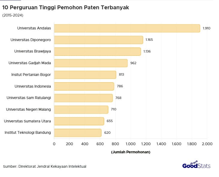 UNDIP, Semarang (28/10) – Universitas Diponegoro kembali menunjukkan kiprahnya sebagai perguruan tinggi riset yang unggul, berdampak dan berdaya saing tinggi di tingkat nasional. Berdasarkan data terbaru yang dirilis oleh Direktorat Jenderal Kekayaan Intelektual (DJKI) Kementerian Hukum dan Hak Asasi Manusia yang diolah oleh GoodStats pada 25 Oktober 2025, UNDIP berhasil menempati peringkat kedua sebagai perguruan tinggi dengan jumlah permohonan paten terbanyak di Indonesia selama satu dekade terakhir (2015–2024), dengan total 1.165 permohonan paten.