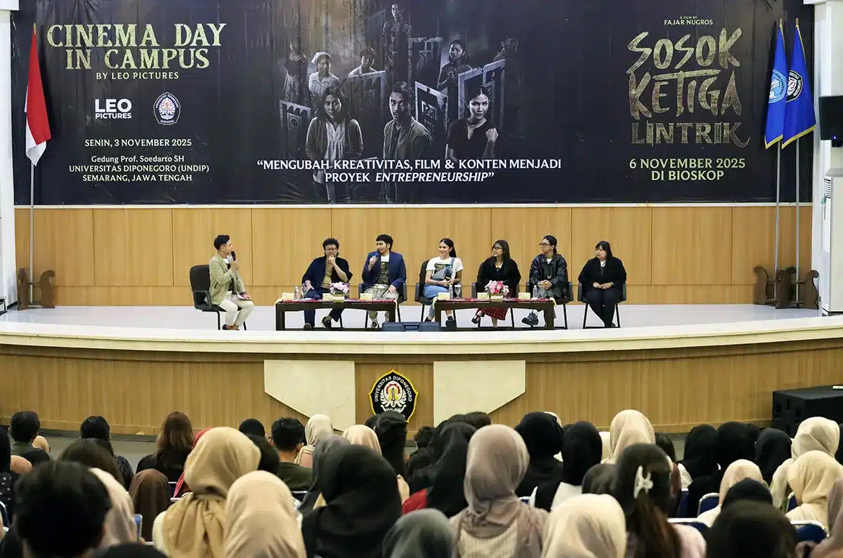 UNDIP, Semarang (3/11) – Gedung Prof. Sudarto, Universitas Diponegoro (UNDIP) dipenuhi antusiasme ratusan mahasiswa yang mengikuti acara Cinema Day in Campus, pada Senin, 3 November 2025. Acara ini merupakan hasil kolaboratif antara Leo Pictures dan Universitas Diponegoro (UNDIP), yang menjadi bagian dari rangkaian peluncuran film terbaru produksi Leo Pictures, “Sosok Ketiga Lintrik”. Acara ini menghadirkan para pelaku industri perfilman nasional seperti Aulia Sarah, Adinda Thomas, Saputra Kori, Vidya Talisa Ariestya, Agung Saputra, dan Ahmad Fesdi Anggoro.
